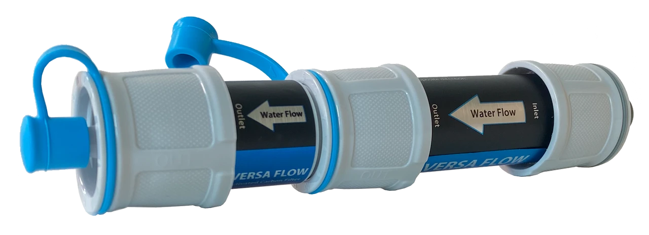 The HydroBlu 2-Stage Versa Flow Lightweight Inline Water Filter kit Includes: 1x Versa Flow Light-Weight Inline Water Filter 1x Second Stage Activated Carbon Filter Element The HydroBlu Versa Flow was designed to be as versatile as you. It easily adapts to your lifestyle and can be screwed onto a plastic water bottle, used inline with your hydration pack, used as a gravity system or bucket filter, or can be used as a straw so you can drink directly from the water source. The Versa Flow water filter is one of the lightest and most convenient personal water filters on the market. Weighing in at only 53 grams you don’t have to worry about adding extra weight to your pack or try to find a dedicated spot for it. It will fit virtually anywhere. This water filter is perfect for backpacking, hiking, camping, travel, and emergency preparedness. Although it is lightweight, it is heavy in features. Every filter is built to exacting standards and exceeds EPA standards for filtration. The HydroBlu Versa Flow has many tiny tubes called hollow fiber. Hollow fiber works through size exclusion. Meaning the hollow fiber tubes have thousands of tiny holes (0.1 microns) that block 99.9999% of harmful bacteria, Giardia, E. coli, protozoan cysts, Cryptosporidium and more. All of these organisms are too large to fit through the 0.1 micron holes. Some manufacturers filter the water through the core of the hollow fiber tubes, but this restricts water flow because only so much water can fit through the core opening. We filter water through the outside of the tubes by bending the hollow fiber. This dramatically increases the surface area and flow rate of the filter while protecting the filter integrity itself. If the core of the tubes become clogged from sediment on competitors’ filters you can no longer use the filter. The difference that the HydroBlu Versa Flow allows you to be able to backflush the filter, clearing out all of the particulate and increasing the lifespan of the filter. If you consistently backflush the filter you can use it almost indefinitely. This means no additional filters, cartridges, pumps, iodine drops, or batteries to ever buy again. The Versa Flow water filter does not remove chemicals or viruses from water. Generally viruses are not found in North America or in municipal water supplies around the world. Check out the HydroBlu Clear Flow Filter Bottle if you are concerned about heavy metals or chemicals in your water. Lightweight and low cost, the Versa Flow should be in everyone’s backpack, survival gear or travel bag. Ideal For: Hiking & Bushwalking Camping Remote Outback Travel International Travel Emergency & Disaster Preparedness For Use With: Inline Hydration – Fitted with standard 1/4″ tube fittings for use with compatible hydration packs & bladders from CamelBak, Osprey, Platypus, MSR etc Inline Gravity – Use the optional HydroBlu Gravity Bags or HydroBlu Bucket Adaptor to allow gravity to easily push clean water through the filter. Also compatible with other brand bags and pouches such as Sawyer & Platypus Water Bottle – Includes standard 28mm female connector that enables it to work with standard soda and water bottles Features: The Versa Flow removes 99.999% of all bacteria, such as E.coli, salmonella, and cholera. It also removes 99.999% of all protozoan cysts, including giardia, cryptosporidium and other protozoa. Hollow fiber membrane Can be used inline with a hydration pack or gravity system Attaches to standard plastic bottle with internal 28 mm threading, can be used inline on hydration packs, gravity or bucket system, or used as a straw to drink directly from your water source Perfect for hiking, backpacking, camping, travel and for emergency situations Flow rate of 3.75 Litres in 5 minutes (gravity fed) Includes Instructions Compatible with other brand accessories such Sawyer & Platypus Medical Grade 0.1 Micron Filtration Membranes Optional Gravity Bags available Filters faster than Sawyer Mini and clogs less often Includes side view window to see internal filter condition Replacement spare second stage activated carbon elements available (sold separately) Includes: 1x Versa Flow Filter 1x Second Stage Activated Carbon Filter Element Technical Specifications (Versa Flow): Filter Material: Hollow Fiber Removes: Bacteria, Protozoan cysts, Giardia, Cryptosporidium, E. Coli, Salmonella and more Filter Life: up to 100,000 gallons (378541 Liters approx) Shelf Life (if kept dry): 5+ years Weight: 53 grams Size: Length 14.5cm, Width 3.9cm Technical Specifications (Carbon Element): Removes: Chemicals Heavy Metals Petrol & Diesel Pesticides & Herbicides Bad Tastes Features: Connects directly to HydroBlue Versa Flow Lightweight Inline Water Filter Removes heavy metals such as lead, iron, cadmium, nickel, chromium, and zinc Removes chemicals such as chlorine, pesticides, herbicides, gasoline, and diesel Increases water clarity Improves water taste Technical Specifications: Filter Material: Activated Charcoal, ion-exchange microbeads, and pre-filter membrane Removes: chemicals, heavy metals, large sediments, negative tastes, and color Filter Life: up to 150 gallons (567 Liters approx) Gravity Bags and accessories sold separately (HB-VF-06)
