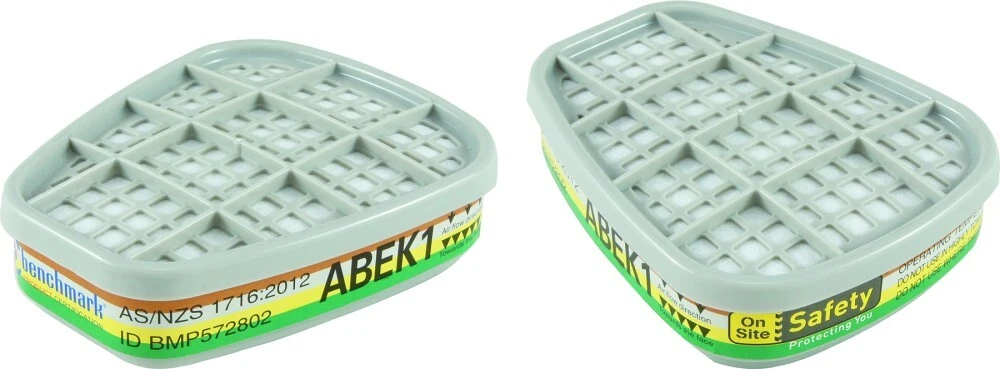 2nd Stage Replacement Cartridge to suit the Dual Stage Filter Half Mask Respirator. ABEK1 Second Stage Organic gases and vapour Inorganic gases and vapours Sulpher dioxide and other acid gases and vapours Amonia and organic amonia derivatives Easy to assemble with click and turn installation Certification: AS/NZS 1716 Supplied as 1 pair (2) Pre-sealed in foil for long shelf life (RHMABEK1C)
