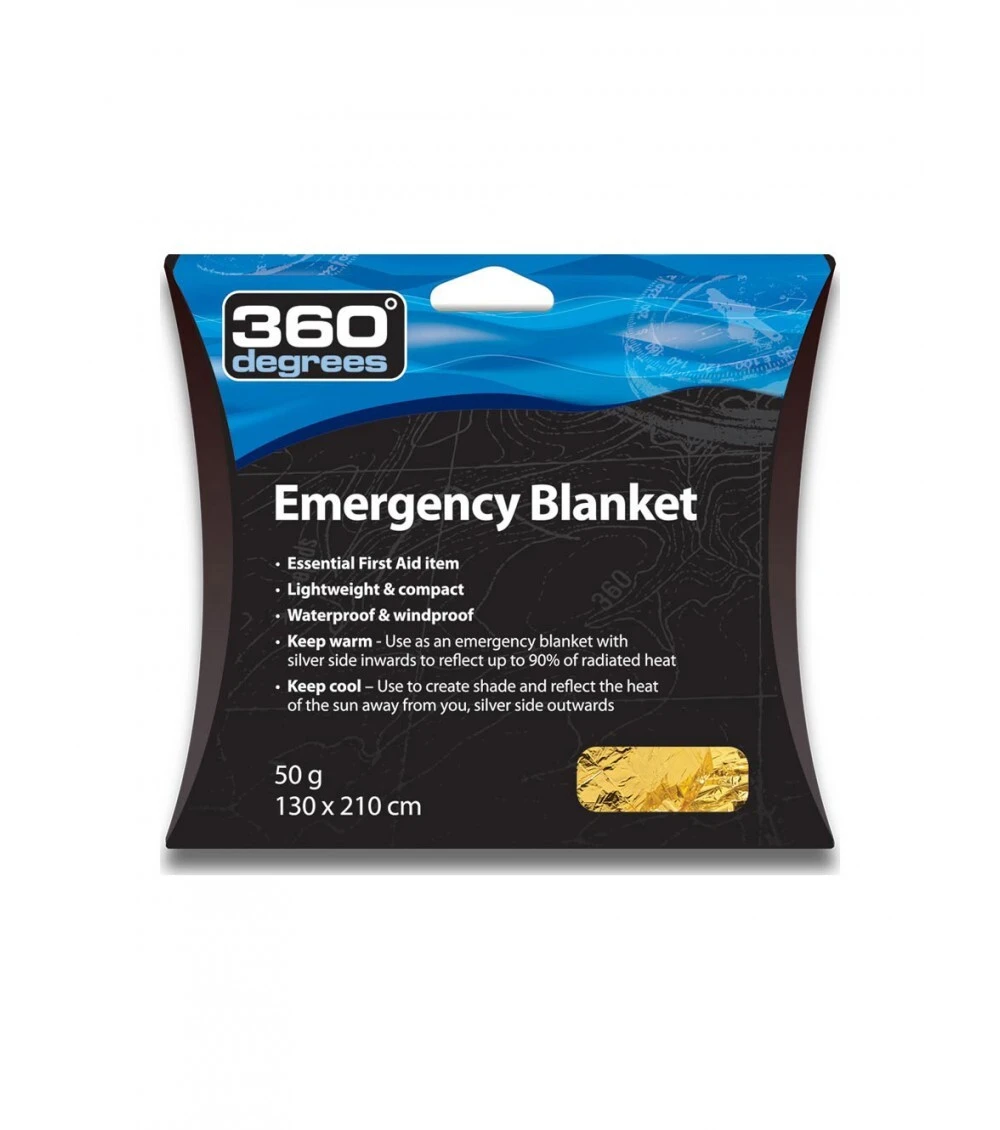 Emergency Blankets are an essential item for your outdoor first aid kit. They can be used to reduce heat losses in a persons body caused by thermal radiation, water evaporation and convection. They can also be used as a ground sheet, or to create an emergency shelter. Features: Lightweight and compact Waterproof and windproof Keep warm: use as an emergency blanket to reflect up to 90% of radiated heat Keep cool: use to create shade and reflect the heat of the sun away from you Gold Colour Size: 130 x 210cm Weight: 50g (360EMBL)
