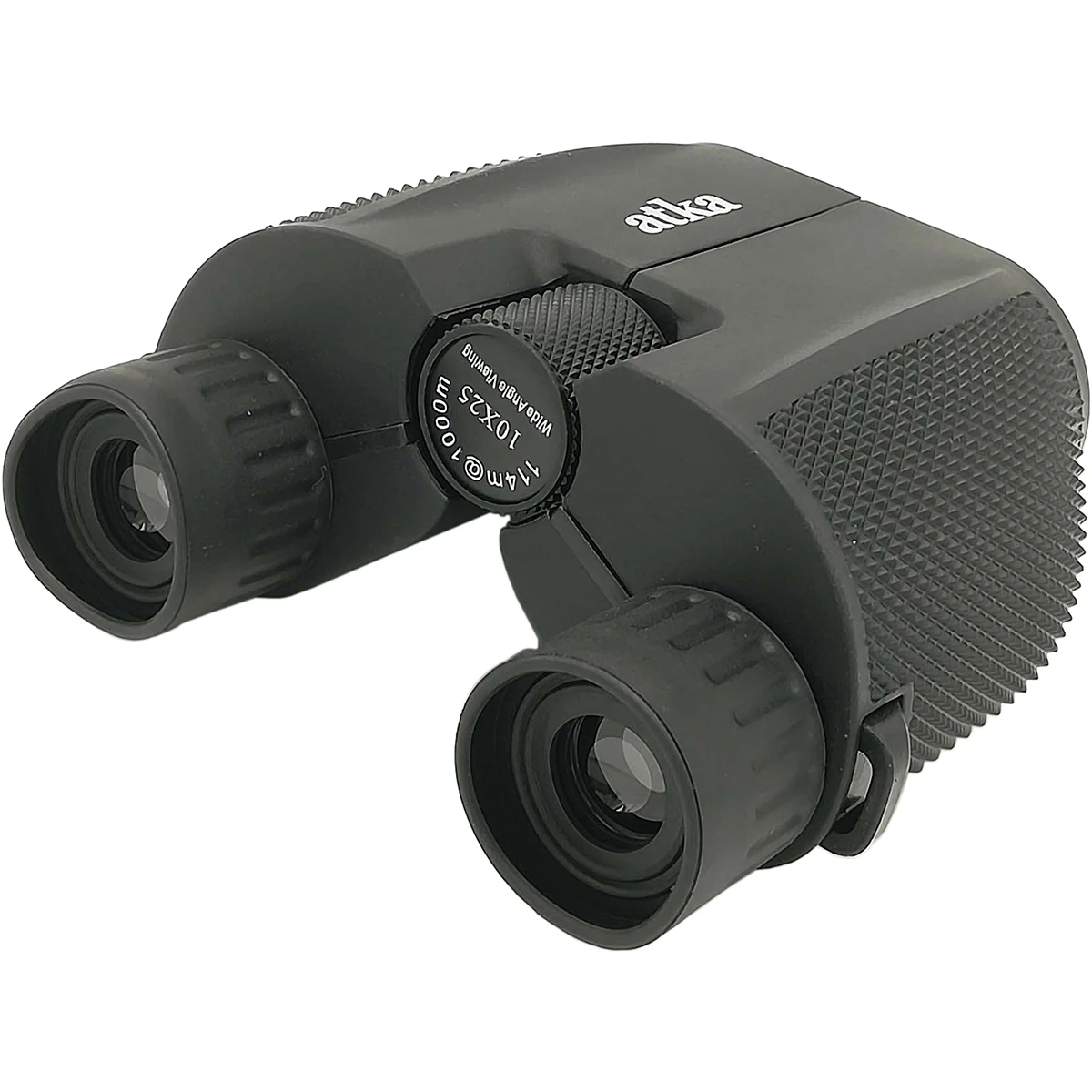 Atka 10 x 25 Binocular A small, casual binocular for multiple uses, offering a 10 x magnification and a 25mm objective lens diameter and a field of view of 101m at 1000m and an angular field view of 5.8 degrees. The light weight (approx. 260g) and the compact size (11 x 6.5 x 4cm) make it highly popular for those on the move. Features: Powerful 10 x magnification Non-slip rubberised construction Rubber eye caps Multi-coated optics Ideal for sport, bird watching, and hunting or if you just like getting close to the action Includes a sturdy travel case with neck strap and lens cloth SPECS: Magnification: 10x Objective Lens: 25mm Prism: Porro (BK7) Lens Coating: FMC Field of View: 114M / 1000M Exit Pupil : 3.1mm Eye Relief: 12mm Close Focus: 5M Weight: 260 grams Includes: Pouch, Neck Strap, Lens Cover, Lens Cloth (AB1001025)