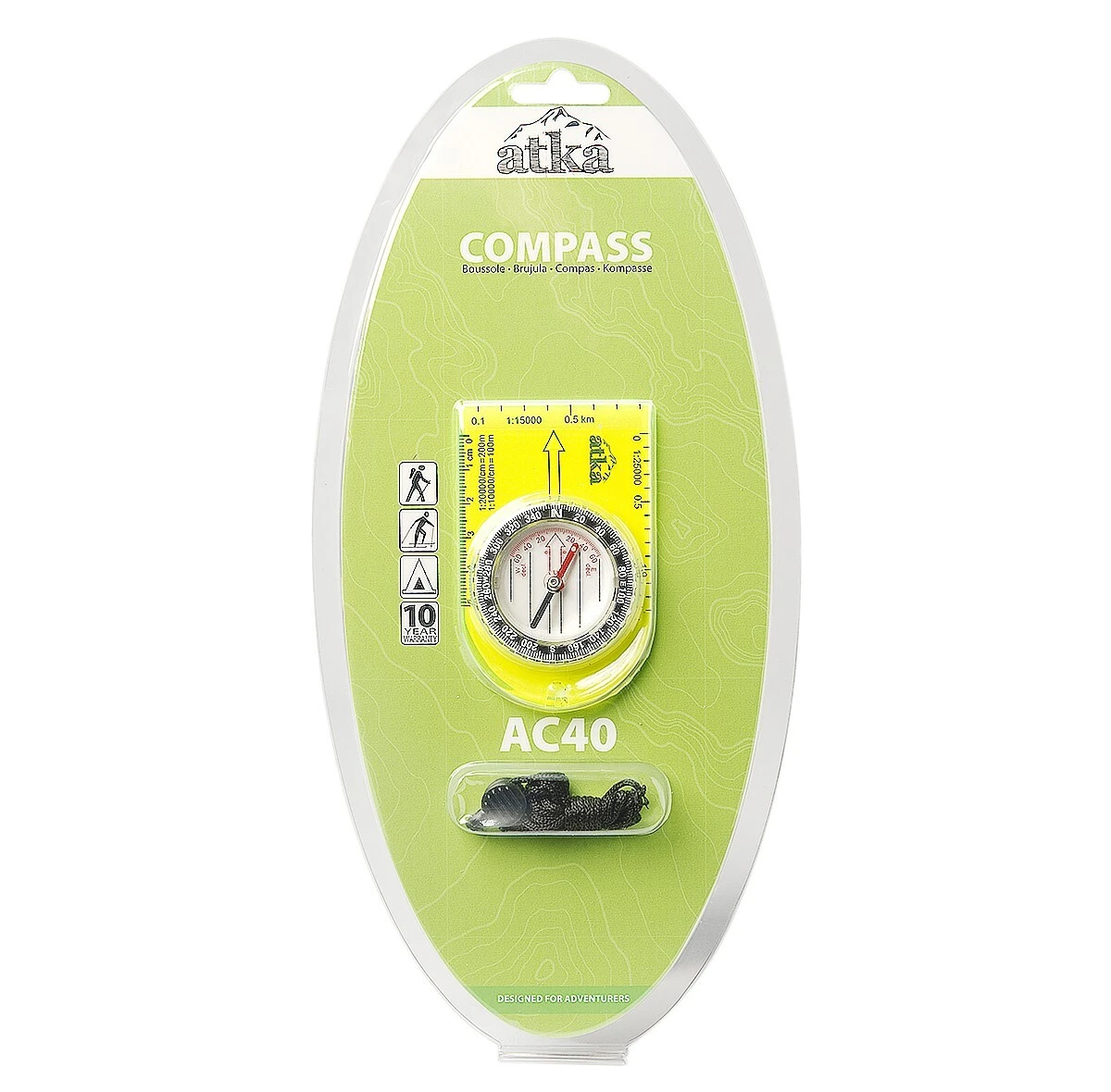 AC40 Compact Baseplate Compass The Atka® AC40 compact baseplate compass features: • Liquid encapsulated global needle • Index line with movable bezel • East/West declination scale • Luminous direction line and North needle • Ruler and compass scale on fluro baseplate • Meridian lines • Lanyard (AC40)