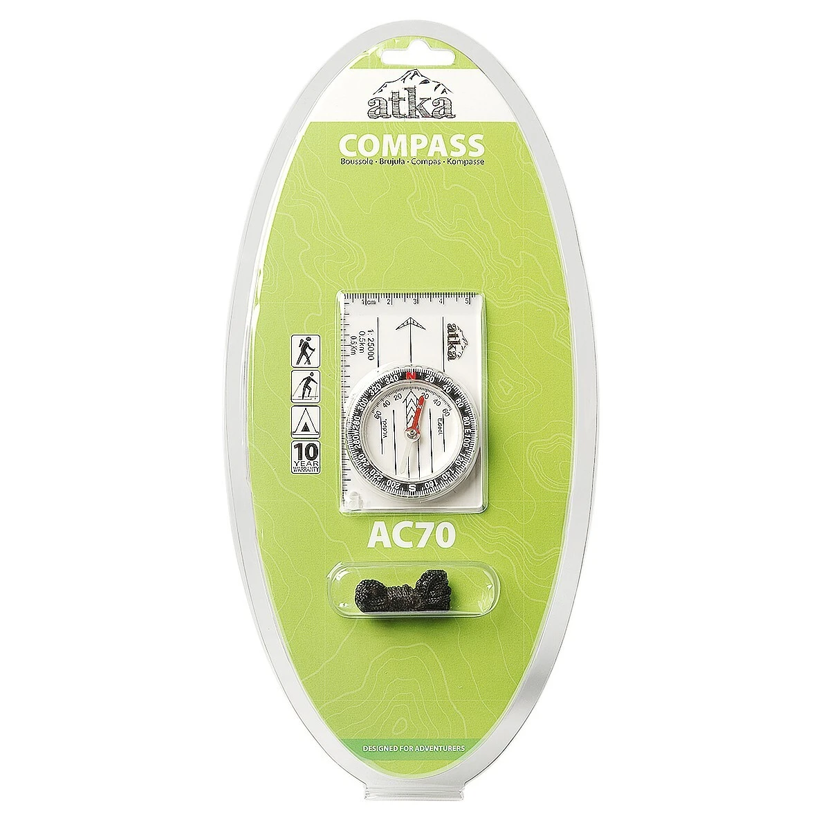 AC70 Baseline Compass The Atka® AC70 baseline compass features: • Liquid encapsulated global needle • Index line with movable bezel • East/West declination scale • Ruler and compass scale baseplate • Meridian lines • Lanyard (XAC70)