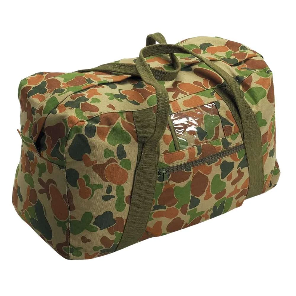 Australian Army ECHELON Gear Bag Auscam Camo 50L The Australian Army Echelon Gear Bag is a large durable canvas bag with AUSCAM print, external side pocket and clear name tage window. Ideal for travellers or cadets and of course military. Dimensions: 60 x 30 x 35 cm Weight: 940g Volume: 50 Litres Material: Heavy Duty Cotton Canvas Camo print: AUSCAM (2EBA)