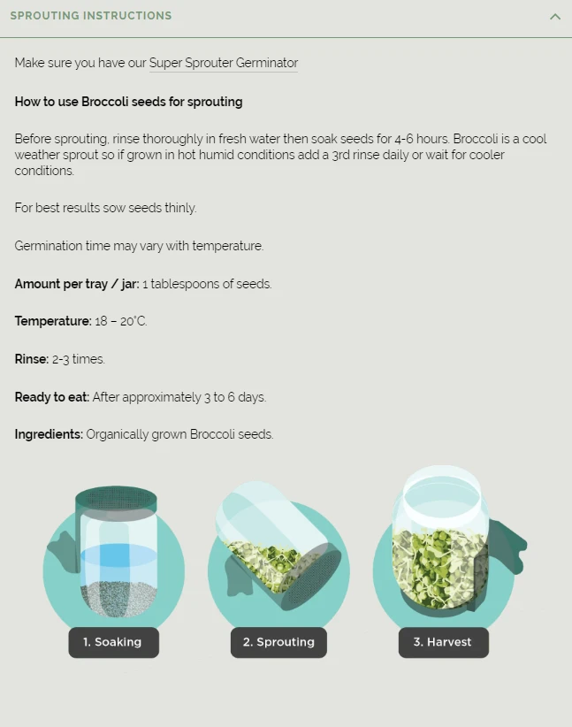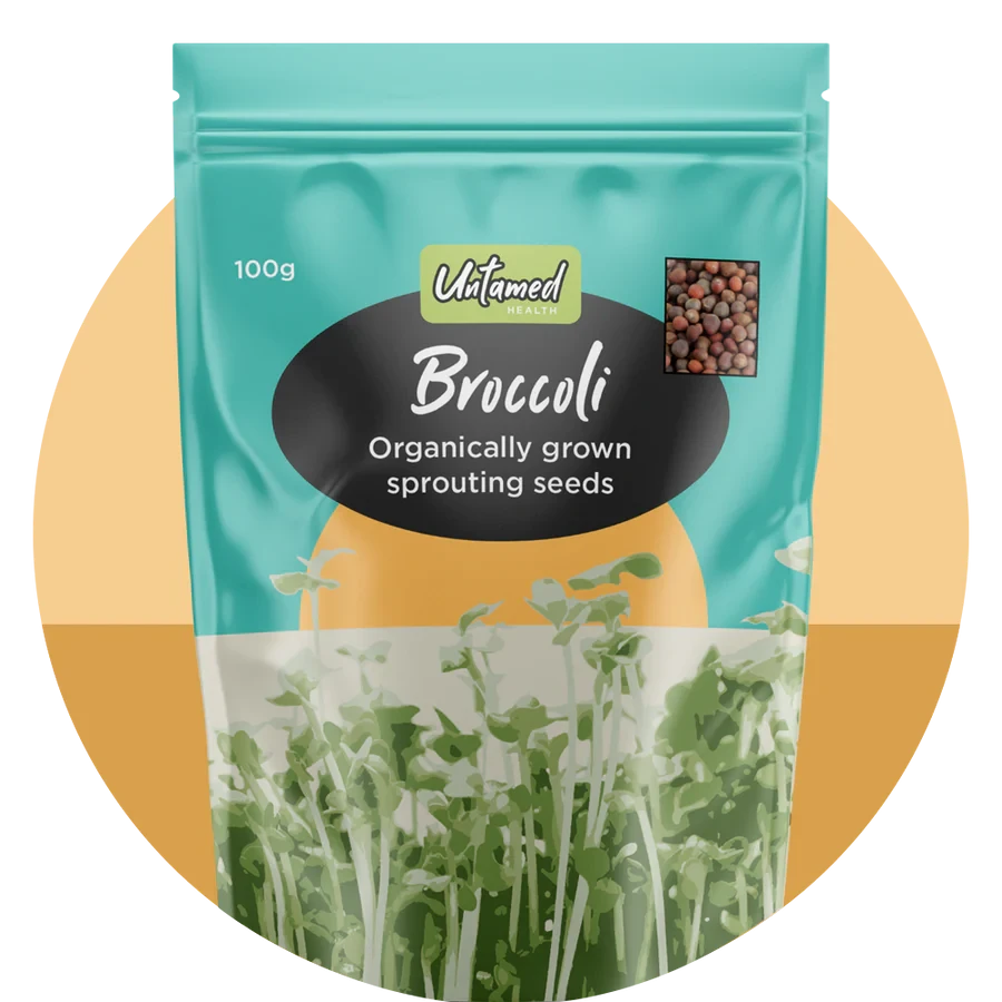 Untamed Broccoli Organic Sprouting Seeds 100g Do you have limited space to grow nutritious vegetables? Live in an apartment or want to try growing something new? Say no more! Grow your own fresh, crunchy, delicious and chemical-free sprouts right on your kitchen bench. All you need is some patience and a jar! These sprouts are all organically sourced from local farmers around Australia and are free from Added Sugar, Gluten, Wheat, Artificial Flavours, Preservatives or Colouring, Peanuts, Nuts, Monosodium Glutamate (MSG), Hydrolysed Vegetable Protein (HVP), Animal By-Products, Artificial Fertilizers and Pesticides, Synthetically Produced Substances, Genetically Modified Organisms (GMO) and Genetic Engineering (GE). Ensuring you and your family get the healthiest seeds possible. Broccoli sprouts complement light meals at any time of the year. The mild flavour and crunch are packed with antioxidants which give a distinct flavour to almost any dish. Broccoli sprouts are an excellent source of essential nutrients and contribute to healthy, balanced nutrition. Broccoli sprouts contain vitamins A, B, C, E, K, as well as Calcium, Iron, Magnesium, Phosphorous, Potassium, Zinc and Chlorophyll. The perfect source of added nutrition for Preppers. Features Organically Grown Sprouting Seeds Great Source of Vitamin A, B, C, E & K, Calcium, Iron, Magnesium, Phosphorus, Potassium, Zinc & Chlorophyll Only need a Jar! Use a Super Sprouter Germinator (Sold Separately) for Optimum Sprouting Efficiency Ready in 3-6 Days! Simply to grow! Grow on your Kitchen Bench! Specifications Weight: 100g Type: Broccoli (000555)