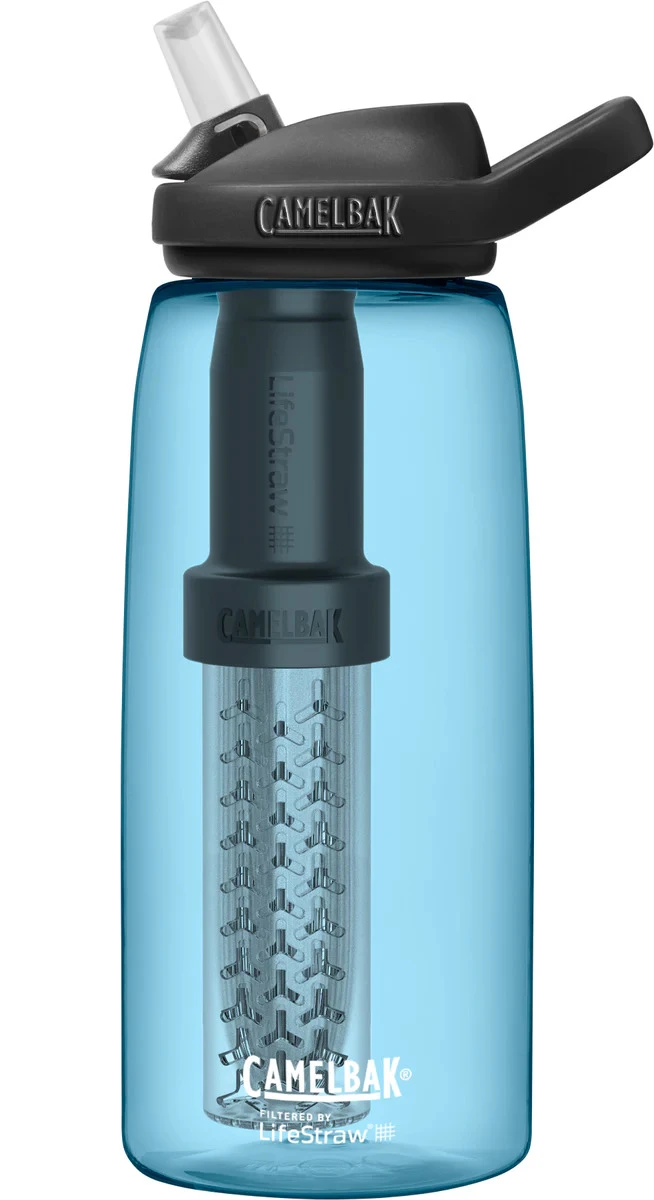 Camelbak Eddy + Filtered by Lifestraw Water Bottle (Clear Blue) Camelbak has collaborated with Lifestraw to bring you the ultimate filtration water bottle. The Eddy + filtered by LifeStraw takes the worry out of hydrating on the go. Water is filtered twice to remove bacteria, parasites, and microplastics, and reduce lead, bad taste, chlorine and other unwanted chemicals – delivering a steady stream of clean and safe hydration. Features: Flip, Bite, Sip Straw Cap – Sip Friendly & Spill-proof when open, Leak-proof when closed Easy to Cary Handle Made with durable Tritan Renew Material – 50% Recycled Material Vacuum Insulated – Keeps water cold for up to 30 hours! BPA, BPS & BPF Free – No toxic nasties Two Stages of Filtration: Stage 1: Hollow Fiber Membrane Removes 99.999999% of bacteria (E. Coli, etc.) Removes 99.999% of protozoa (Giardia Cryptosporidium, etc.) Removes 99.999% of microplastics Filters up to 4,000 litres Stage 2: Ion Exchange Filter Reduces chlorine and lead Removes bad odour and taste Removes organic chemical matter (Pesticides, Herbicides) Filters up to 100 litres. Replacement available here 1L Capacity without Filter or 770ml Capacity with Filter inside Trusted Lifestraw Filter Use every day around the home, Camping, Hiking, Fishing, Water Sports or Traveling Easy to Clean – Dishwasher Safe Specifications: Size: 1L Colour: Clear Blue Weight: 250g Replacement Ion Exchange Filter CLICK HERE (886798034072)
