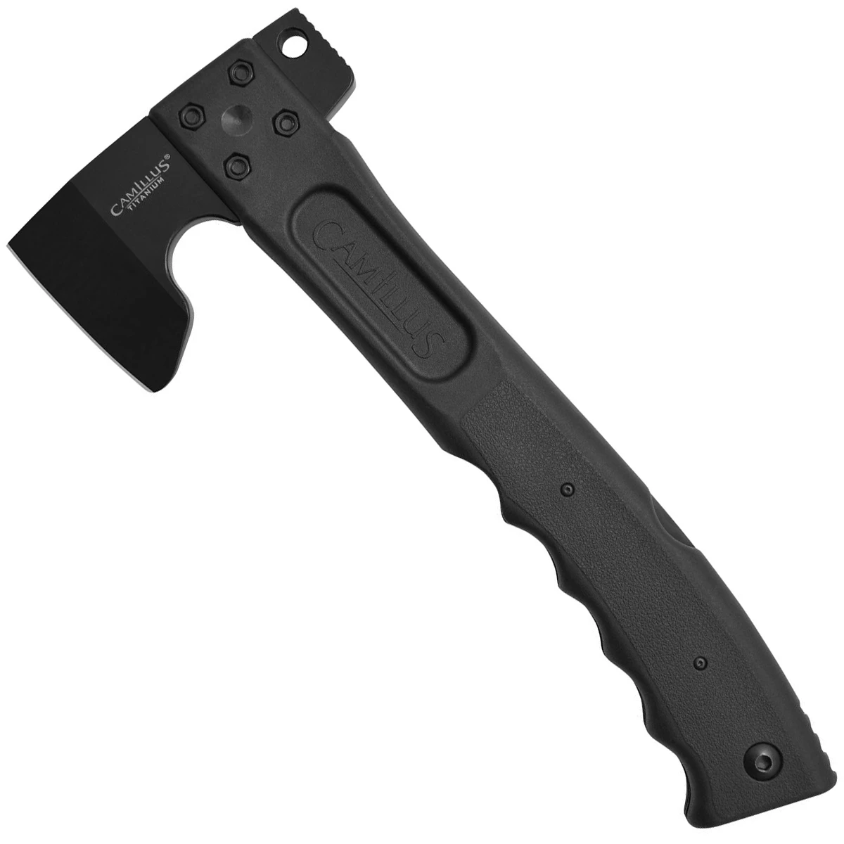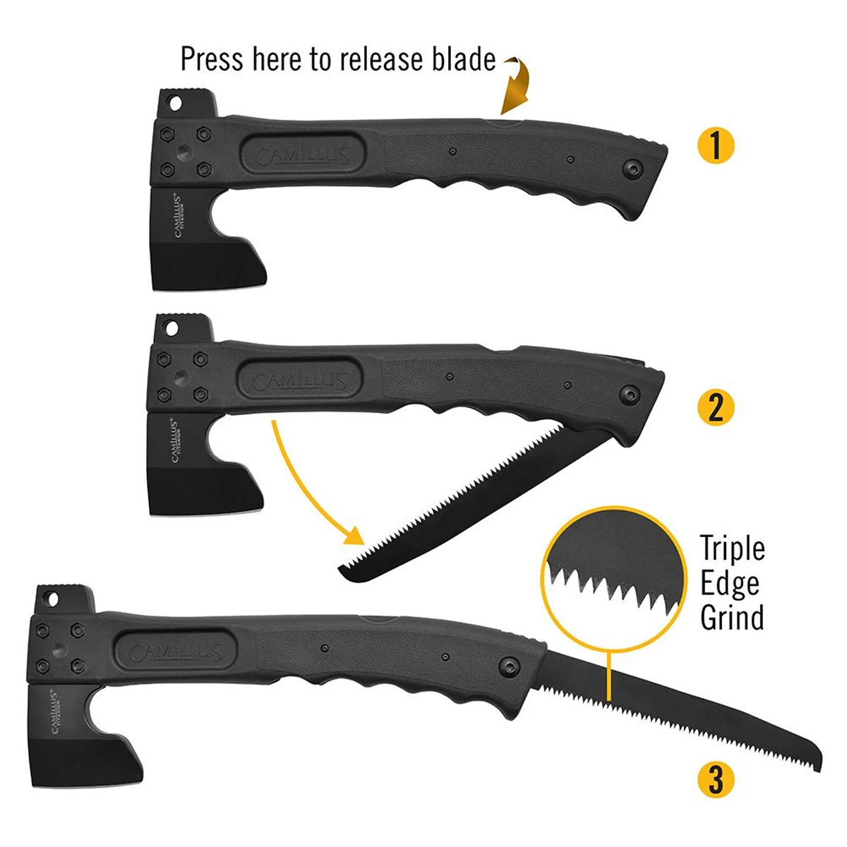 Camillus Camtrax Hatchet and Folding Saw 3-in-1 The Camillus Camtrax 3-in-1 Hatchet including a hatchet, lock Back saw, and hammer with a moulded sheath to secure it all, the Camtrax is one of the best outdoor product combinations ever created. The overall length comes in at 310mm between the 7.5cm Titanium Stainless Steel hatchet blade and the 18cm Lockback folding saw. Along with a Glass Filled Nylon handle and sheath that has a reversible belt clip, you can wield and carry this epic tool assemblage with the utmost security. Such secure grips and storage solutions are thanks to how Camillus manufacture Glass Filled Nylon components. By adding glass-filled materials to polypropylene, ABS and other substrates, we can deliver the strongest, most rigid handles and sheaths so you can focus more on the challenges the field throws at you rather than the integrity of your equipment. Along with an integrated bottle opener and Lifetime Warranty, you have everything to gain by adding the Camtrax 3-in-1 Hatchet to your kit. Features: 7″ (18cm) Saw Blade Ergonomic Grip Triple Edge Grind Saw Blade Integrated Hammer Folding Saw Blade Chop, Saw, Hammer Lifetime Manufacturers Warranty Moulded Sheath + Reversible Belt Clip with Bottle Opener Specifications: Dimensions: 31cm x 12.5cm x 3cm Includes: 3-in-1 Hatchet, 1 x Moulded Sheath Handle Material: Glass Filled Nylon Handle Colour: Black Blade Treatment: Titanium Bonded (19142)