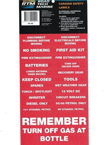 Self-adhesive caravan safety labels. For best results, make sure the surface is clean and dry before application. 23 Individual stickers Waterproof UV- Resistant Vinyl (TSC-602)