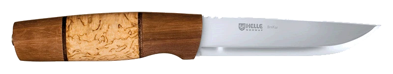 Helle-Braker Knife 126mm Triple Laminated Blade with Tan Leather Sheath Enjoy the outdoors with the tough and beautifully crafted Helle BraKar Knife. Each knife is hand made in Norway, since 1932. The BraKar is a traditional Norwegian style knife consisting of a 126mm long blade made from Helle’s triple laminated stainless steel. The handle is a combination of walnut and cirly birch that has been contured to match the users hand to allow for maximum dexterity during use. A finger guard has also been shaped into the handle to protect the users hand from slipping down the blade during use. The BraKar comes with a traditional brown leather sheath for storage when not in use. Features: 126mm Long Blade Blade made from Triple Laminated Stainless Steel Combination of Walnut & Circly Birch Wood Handle Contured Hand to improve Dexterity Protective Finger Guard Includes Traditional Brown Leather Sheath Hand made in Norway using traditional craftmanship Specifications: Knife Weight – 124 grams Combines Knife & Sheath Weight – 169 grams Blade length – 126mm Handle Length – 12.5 cm Overall Dimensions – 26 cm x 3.5cm x2cm (Without Sheath) Please note: You must be over 18 to purchase this product. (BraKar)
