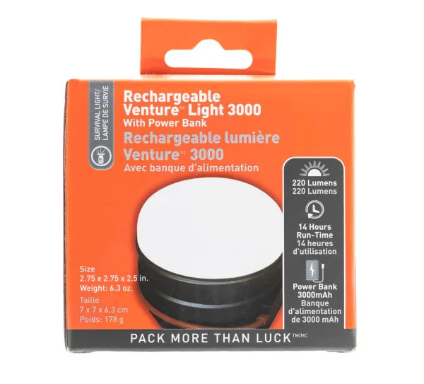 Rechargeable Venture Light 3000 w/ Powerbank Be prepared for the unexpected with the SOL Rechargeable Venture Light 3000 with Power Bank. Use this lantern-power bank combo at home or out on the trail. Three lighting modes with a max 220 lumens will light up your workspace, tent, or campground. Signal for help with the SOS Flash mode which can run for 24 hours. Never be without a way to recharge with the integrated USB cord. Charge your phone or other electronics with the micro-USB port, powered by the 3000mAh Power Bank. Features: Lantern-Power Bank Combo – A rechargeable lantern and power bank in one. Rechargeable Battery – Plug in the integrated USB cord to recharge the battery. Convenient Power Bank – Capable of charging multiple devices on a fully charged battery. Multiple Lighting Modes – Pick the perfect mode for any situation with High, Medium, and SOS Flash. Hang Anywhere – With wire bail hooks and magnets, hang on branches, rope, cars, tent poles, or anywhere you need some extra light. Recharge Time – Lantern & power bank recharge in 5 hours Specifications: Dimensions: 7cm (Diameter), 6cm (Height) USB Cord Length: 21.5cm Recharge Tie: 5 Hours Run Time: 6 Hours (220Lumens), 14 Hours (110 Lumens) Powerbank Size: 3000mAh Weight: 178g (0140-1305)