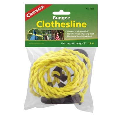 Coghlan’s Bungee Clothesline The unique design of this clothesline eliminates the need for clothes pegs, making it lightweight and convenient. Simply feed portions of fabric between the two strands of bungee and the tension will hold your clothes in place! Features No pegs or pins needed Includes length adjusting hook Lightweight & convenient Flexible & compact – Easy to store away in your pack or camping gear Specifications Unstretched length: 1.8m (COG0433)