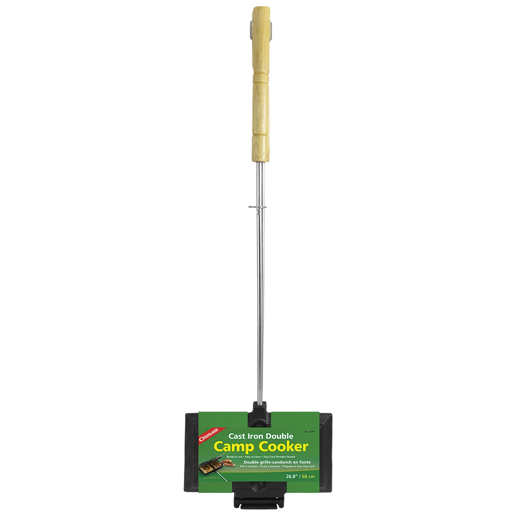 Camp Cooker Double Toasted Sandwich Maker Perfect for couples & families, this twin jaffle maker is made from durable cast iron. This toastie maker offers a convenient way to toast sandwiches, grill meats, and cook delicious desserts over an open fire or nestled between coals. The Camp Cooker has a two-part hinge and wooden handles that unscrew, making cleaning easy and allows it to be broken down for easy transportation. The cast iron comes pre-seasoned, so it features a non-stick finish that needs to be renewed after each use. It features a stay-cool wooden handle that is easy to use and latches together with an S hook around each handle. The cast-iron plates are heat resistant and will not melt when used over an open fire. Features Great for making perfect pies, Jaffles, or grilling meat Nests in the coals for easy cooking Break-apart hinge design allows for easy cleaning Instruction and recipe book included Pre-seasoned Cast Iron construction Specifications Handle Length: 52cm Complete length with handles: 68cm Weight: 1.9kg (COG2044)