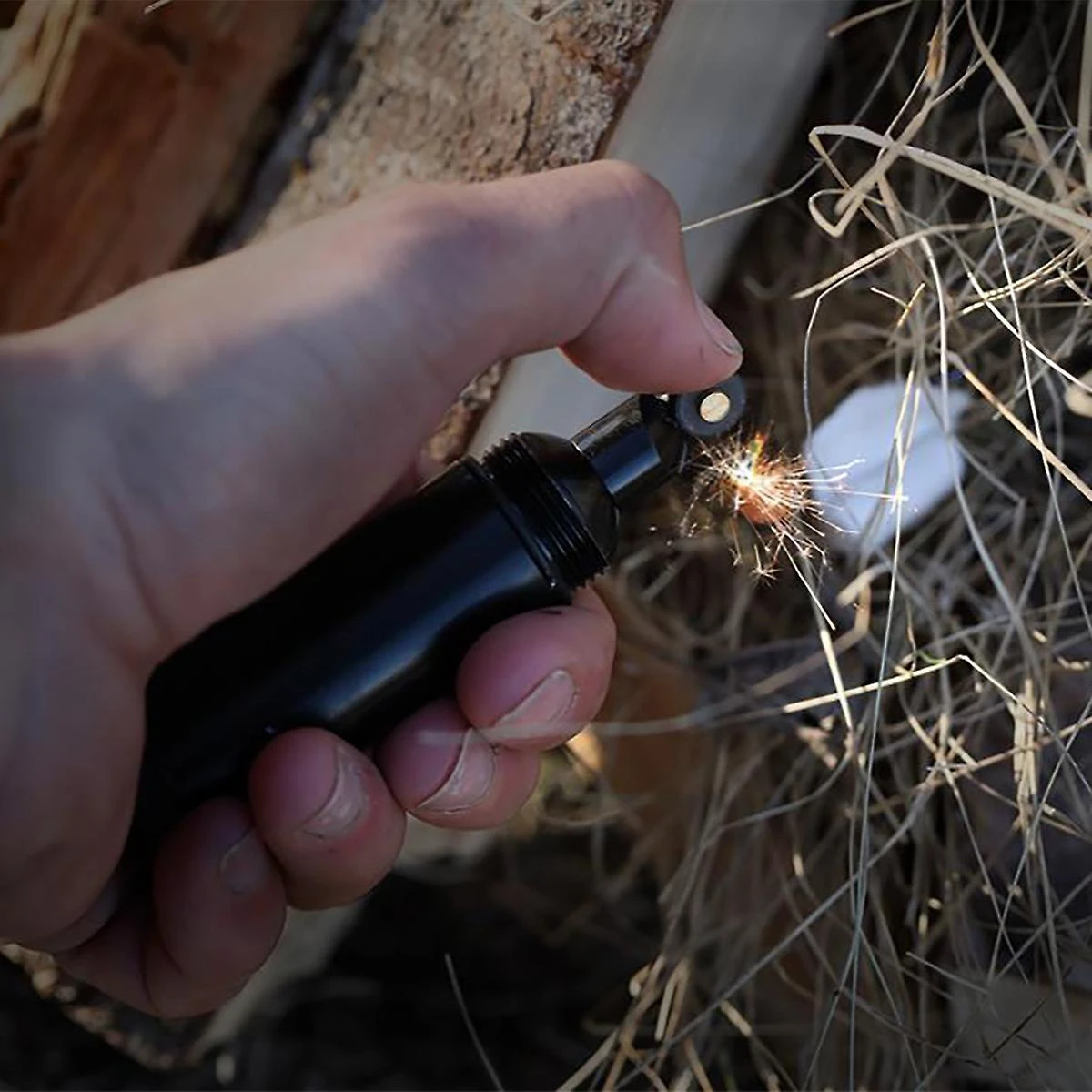 Flint Wheel Fire Starting Kit All you need to create a fire in a compact, tough, and handy aluminium watertight capsule. The capsule separates to access the Flint Wheel, then remove the bottom cap for access to the storage compartment with the tinder firestarters inside. Includes two spare flints and six tinder firestarters made from cotton and paraffin wax. Attach to the outside of your Bergen Pack with the included carabiner clip. Features Complete Firestarting Kit – 3 Flint Wheels (1 Installed, 2 Spare), 6 Tinder Firestarters, Watertight Capsule Case with Carabiner Clip Watertight Capsule Case – Ideal for Water Sports adventures Carabiner Clip – Conveniently attach to your Bergen for easy access when you need it Durable Aluminium Case Refillable Specifications Weight: 90grams (2226)