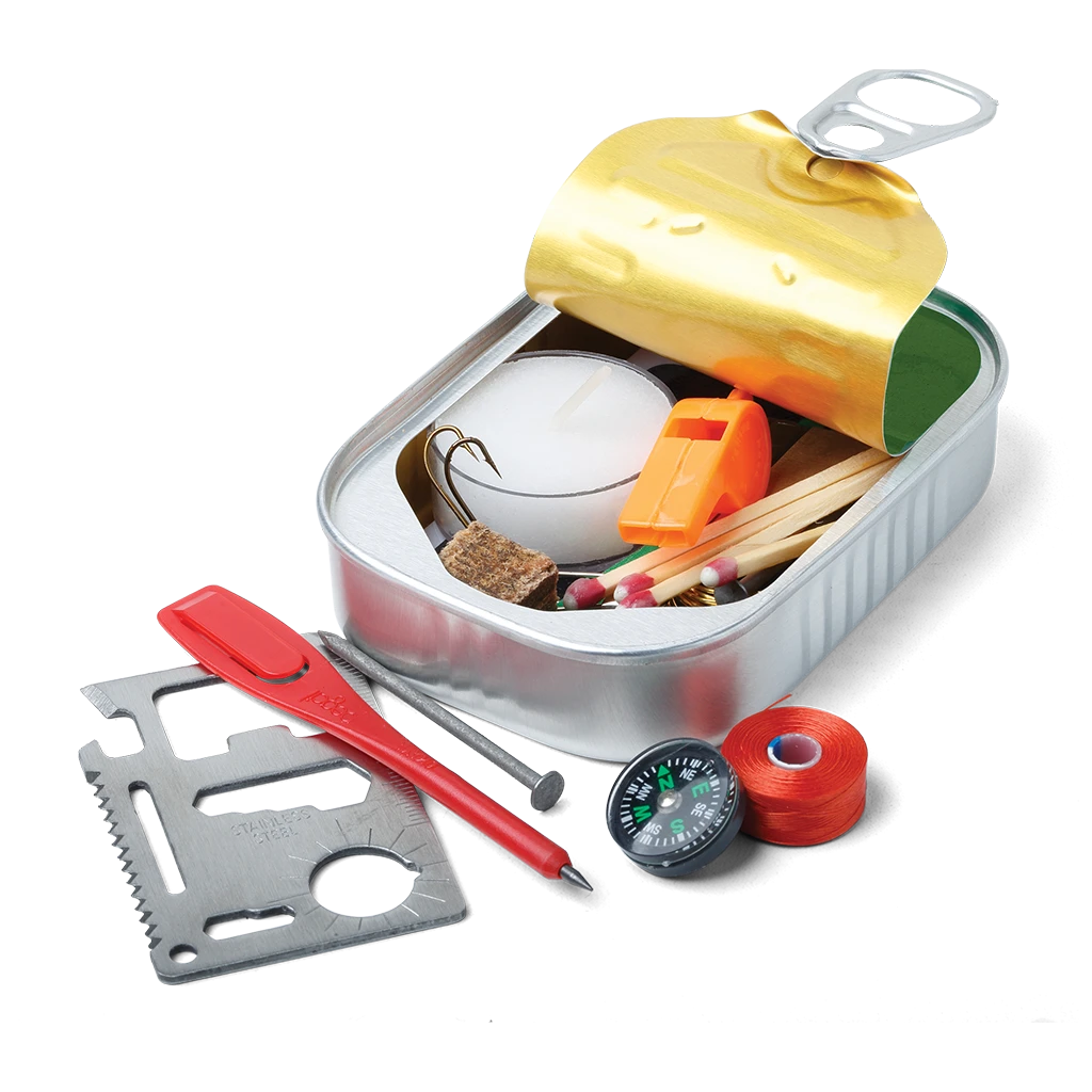 Survival Kit in a Can The Survival Kit in a Can is an excellent addition to emergency kits, bug-out bags or simply to keep in the glove box or kitchen drawer for those unexpected survival situations! It contains 32 items including survival products which, along with training and common sense, can save your life. Factory sealed, the can assures both the usability and the completeness of the list of contents. When opened, the can provides a cup, cooking pot and bailer. It may be small but it’s compact, lightweight, watertight (until you open it!) and feature packed making it perfect to keep on hand for when disaster strikes! Features 32 Piece Survival Tin Includes items for signalling, fire starting & shelter Compact & Lightweight Ideal for Emergency Preparedness What’s Inside: 1 x Multi-Function Credit Card Survival Tool 1 x Sewing Needle 1 x Signal Whistle 1x Survival/First Aid Information Pamphlet 1 x Pencil Note Paper 914cm (3′) Reflective Cord 1 x Compass 2 x Firestarter Cubes 3m (9.8′) Multi-Use Cord 91cm (3′) Multi-Use Wire 4 x Waterproof Matches 31m (101′) Fish Line/Sewing Thread Match Book 3 x Twist Ties 30cm (12″) Duct Tape 1 x Signal Mirro Resealable Bag 2 x Nails 2 x Safety Pins 2 x Fish Hooks 1 x Razor Blade 1 x Tea Light Specifications Dimensions: 11cm x 7.5cm x 2cm Weight: 110 grams (COG9850)