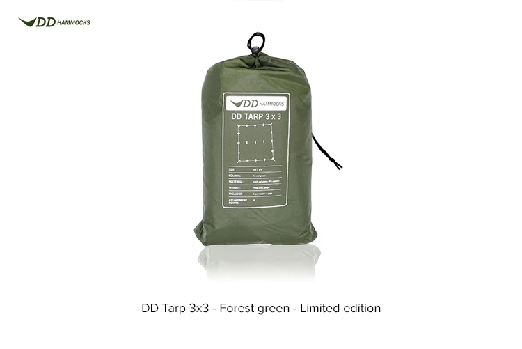 DD Hammocks DD Tarp 3×3 Our recommended shelter for hammock campers of all experience levels, the DD Tarp 3×3 offers reliable protection wherever you go. Its 19 reinforced attachment points offer a huge number of setup options, and it’s the tarp of choice for bushcraft & survival schools, the military and countless wild campers worldwide! Highly versatile. With the perfect dimensions for regular sized hammocks, the DD Tarp 3×3 is what we recommend as ample cover for a single person plus gear. Arrange it in an A-frame or diamond over your hammock for all-round protection, or simply use it to extend a porch on your tent. Cook underneath it. Use it as a groundsheet or Craft it into a tipi-tent. A perfect Multi-Use Tarp for a survivalist to have! Features 19 tough reinforced attachment points: 16 around the sides and corners, and 3 along the centre (ridge line) 4 pegs and guy lines included in their own bag Made from 190T polyester with PU 3000mm waterproof coating, and has a taped central seam Stuff sack with drawcord closure Specifications Size: 3m x 3m Colour: Olive Green, Coyote Brown, Jet black, Sunset orange, Forest green (limited edition) (Please Select Colour) Weight: 790g (excl. pegs & guy lines) Includes: Tarp 3×3, 4 x pegs & guy lines, stuff sack Packed size: Approx 24cm x 14cm x 4cm (DDTarp3x3_P)