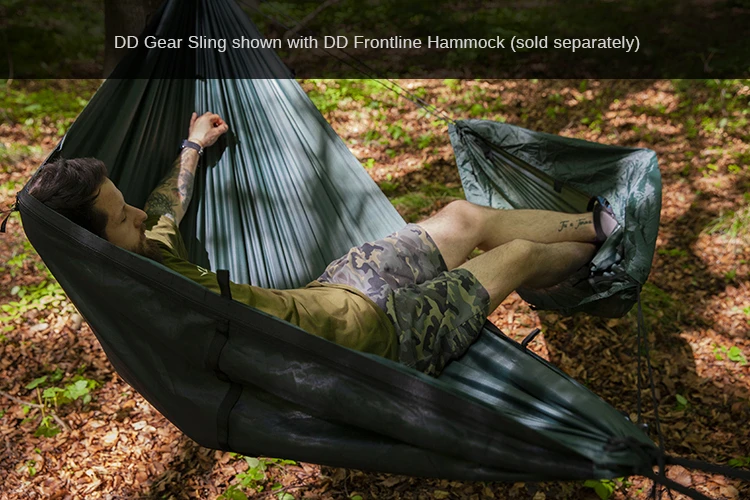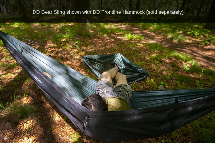 DD Hammocks DD Gear Sling (Olive Green) The DD Hammocks DD Gear Sling is a handy lightweight accessory for any hammock camper, the DD Gear Sling is the perfect solution for keeping your equipment off the ground! Simply sling your rucksack, food, clothing, cooking equipment and/or walking poles into the sling to keep them away from the damp or unwanted visitors – all within reach from inside your hammock! The DD Gear Sling attaches easily to any hammock’s suspension system, using the two included 3m lengths of paracord. Features 1.2m x 1m sling – attach it underneath your hammock for easy access, or anywhere else! Gathered ends, with cords for suspension. Compatible with all DD hammocks Smart storage Keep Gear off the ground away from Pests or the Wet Specifications Size: 1.2m x 1m Colour: Olive Green Weight: 155g Includes: Gear Sling, 3m Paracord suspension (x2) Weight limit: 25kgs (DDGearSling-OG)