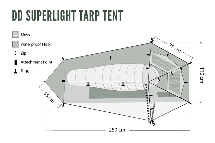 DD Superlight Tarp Tent (Olive Green) 1 Person This tent comes with 12 of DD’s strong SuperLight pegs and 8 black SuperLight guy-lines, however, also included with every tent are 2 extra spare pegs and a full set of fluorescent guy-lines. This means that you can choose between stealthy black, or bright guy-lines for visibility at night. The DD SuperLight Tarp Tent is Ventilated, waterproof and bug-proof and it is Spacious enough for a solo camper plus a rucksack. With a 3,000mm PU coating and a sheltered side door, it’ll keep you dry in stormy weather while its 3 air vents prevent condensation inside. Features Suitable for 1 person (plus rucksack) Made from single-layered SuperLight ripstop nylon, with 3,000mm fully waterproof PU coating throughout 1 light, foldable pole to support the foot end Fine mesh inner door, to keep insects out and allow ventilation Taped seams Small porch to direct water away from the entrance – can be rolled up and fastened out of the way 3 vents to increase airflow and prevent condensation 2 x fabric caps, loops and eyelet straps at the front to slot hiking poles 4 optional guy-out points (2 at either end) for extra security in windy conditions 2 x Spare pegs included Specifications Dimensions: L: 250cm, W: 150cm, H: 95cm Dimensions Packed size: 31cm x 13cm x 12cm Colour: Olive Green Weight: 710g excl. pegs & guys Includes: SuperLight pegs x 12 (for set-up), 2 x spare SuperLight pegs, 3 x Black SuperLight guylines (2m), 5 x Black SuperLight guylines (1m), 3 x Fluorescent SuperLight guylines (2m), 5 x Fluorescent SuperLight guylines (1m) Click Here to download DD SuperLight Tarp Tent instructions (PDF) (DDSuperLightTarpTent_OG)