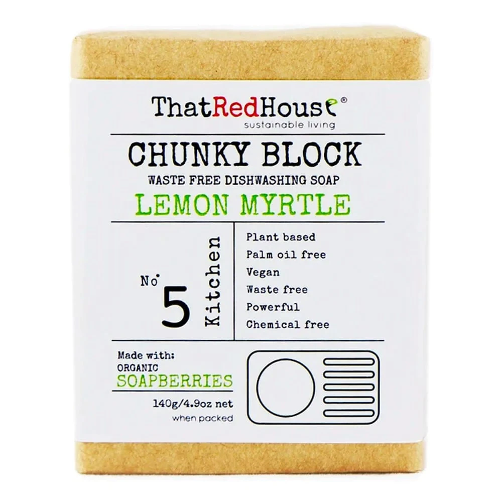 Dishwashing Soap Lemon Myrtle 140g Versatile soap block made using powerful organic Soapberries and pure Lemon Myrtle essential oil, these chunky multi-purpose soap blocks can replace liquid dishwashing detergent, hand soap, and general cleaning soap in the kitchen and household, even in the outdoors. Vegan-friendly and palm oil free, made from plants and plastic free. Compact & dries out for easy stowing when hiking or camping. Features: Made in Australia Naturally scented with essential oils, avoiding synthetic chemicals and fragrances. Palm oil free., Plastic-free & Vegan friendly Compact – No need to carry extra water Ideal for minimalist camping and van life Specifications: Size: 140g Dimensions: 7.5cm x 6cm x 3cm (001415)