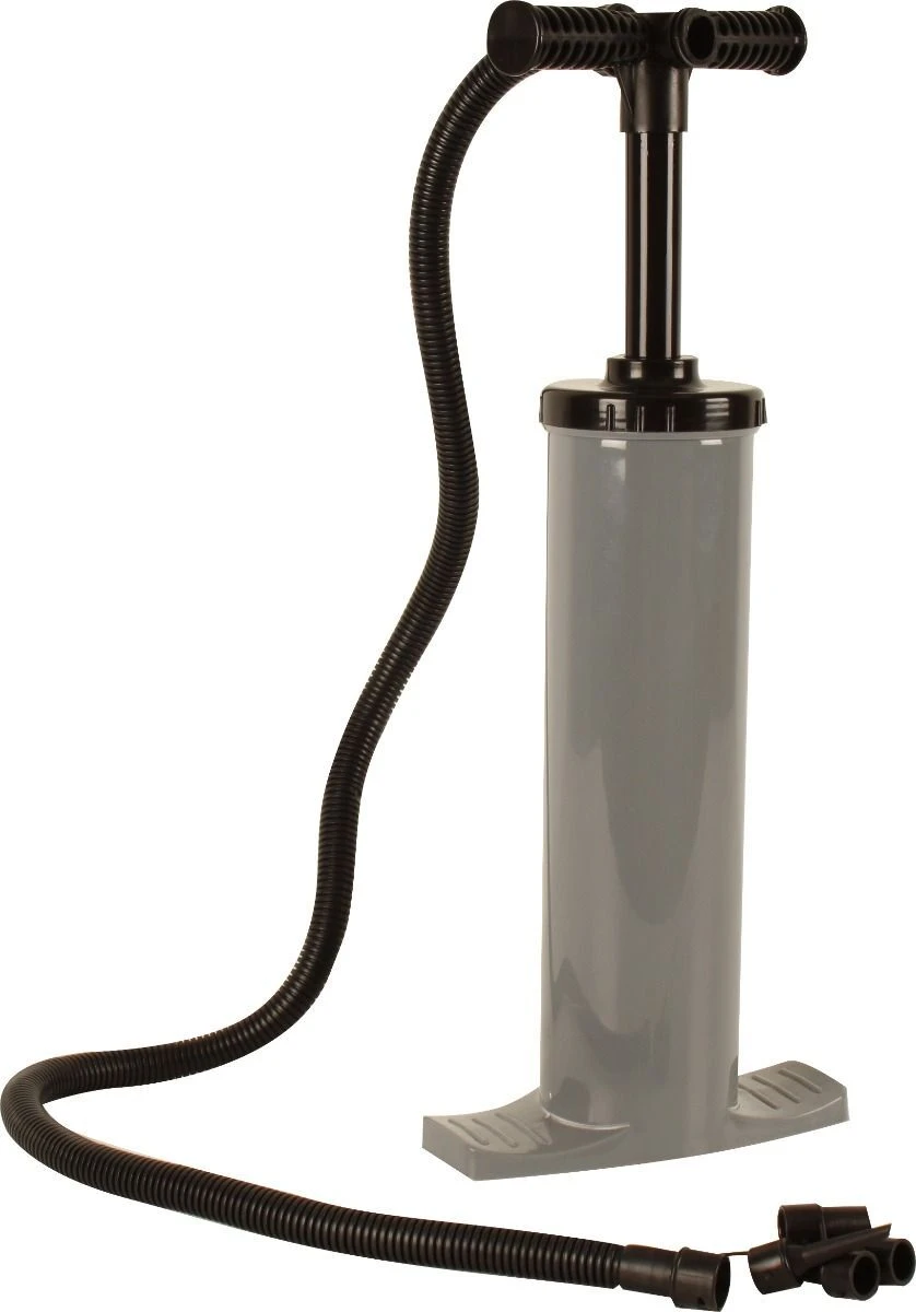 Double Action Air Hand Pump A handy tool for your next camping trip. Inflate Air beds or Camp Mats quickly with the Double Action Air Hand Pump. Features Three pump nozzles included Hose and nozzle lock Footplate for easy pumping Double action airflow Accordion-style hose Rate pressure: 0.3 bar Inflate and deflate 1400CC X2. Specifications Weight: 750grams (CA0000)