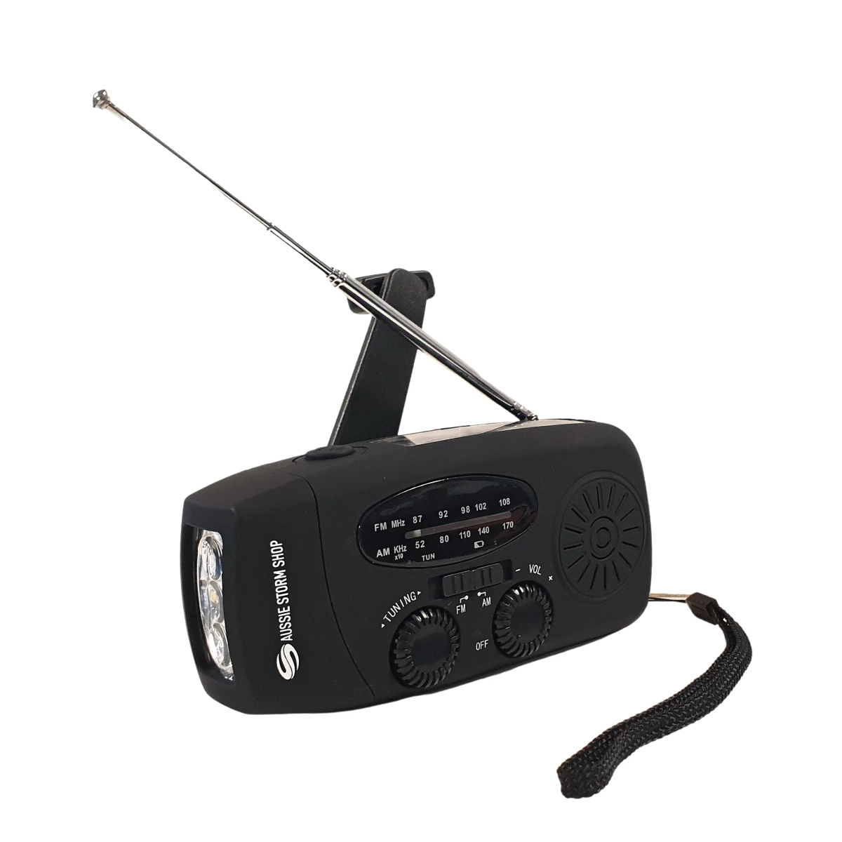 Dynamo Solar Hand Crank AM FM Radio & Power Bank & LED Flashlight Are you prepared for a disaster event? Here’s how you start preparing for an emergency. This multi-feature Solar Hand Crank Radio will be the first item you’ll turn to when the lights shut off. Able to receive AM & FM Radio plus an adjustable Telescopic Antenna so you can find the best reception where you are. Use on rainy days with the IPX3 Water Rating. Switch to the LED Torch or Power bank to emergency charge your mobile phone or Tablet. Features AM/FM Radio – Choose between AM or FM Radio to suit your needs Telescopic Antenna – Ability to Improve & Adjust Reception to hear Incoming Transmissions 1 Watt LED Torch – Low Power Consumption so it can Last Longer Charge by Solar, Hand Cranking or Micro USB – Built-in Solar Panel means you will always be able to use it no matter the Survival Conditions LED Charging Light – Know your torch is Charging when you see the illuminated Charging Light Charge Mobile Phone & Tablet – Charge Via the Rear Standard USB for Emergency Use of your Small Devices IPX3 Water Rating – Splashproof Design Specifications Water Resistant Rating: IPX3 (Splash Resistant) Dimensions: 128x60x45 (mm) Weight: 300g Each Includes: 1x Solar Hand Crank AM FM Radio & Power Bank & LED Flashlight, 4x Micro USB Cables Radio Frequency Receiver Range: AM: 520-1710KHz, FM: 87-108MHz Power source: 3.7v 1000mAh Li-ion battery (Larger than the previous model) Colour: Black Hand Crank Specifications: 1 Minute of Cranking = 15-20 Minutes of Torch or Radio Power or 3-5 Minutes of Phone or Tablet Charge Solar Charge Specifications: Approx 10-12 Hours of Sunlight for a Full Charge Micro USB Charge – Approx 3-4 Hours for a Full Charge Discharge Protection: When the battery voltage is discharged to 2.5v the unit will stop until it’s recharged to protect the battery. * We recommend ‘topping up’ the internal battery every 2 months by charging with solar, hand-crank or USB to extend the battery’s life and to keep it ready for power blackouts and storm season. (DWUP_Black)