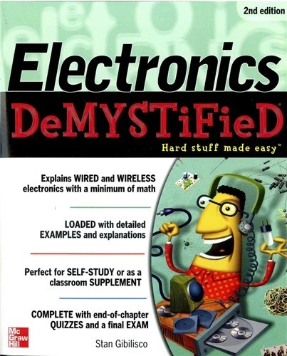 Electronics Demystified by Stan Gibilisco Part of the popular Demystified series, this book teaches you electronics theory. It avoids heavy mathematical formulae, but, be warned there are equations in this book. They are not seriously hard though! The book starts at simple D.C. circuits, goes through A.C. circuits, impedance, reactance, Power Supply concepts, semiconductor basics, amplifiers, oscillators, RF, telecommunications and finishes on antennas. At the end of each chapter is a straightforward quiz (multiple choice) to make sure you are on top of concepts. Features This is the best-written technical book on novice to moderately advanced electronics we have seen. Read this book and understand it, you are a serious techo. Explains Wired and Wireless electronics with a minimum of math Loaded with detailed examples and explanations Perfect for Seld-Study or as a classroom supplement Complete with end-of-chapter quizzes and a final exam Specifications Dimensions: 230 x 185mm Physical structure : Bound back soft cover Title : Electronics Demystified Subject : General Electronics Page count : 468 pages Knowledge Level : Beginner Edition / Printing : Second ISBN : 978 0 07 176807 8 Publisher : McGraw-Hill Author : Stan Gibilisco (BM7106)