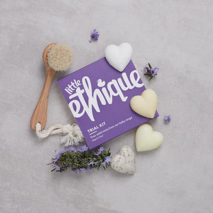 Ethique trial kits are designed to give you a taste of the plastic-free life and are perfect for travelling. Containing four minis; across hair, face and body. Each mini lasts for between 5-15 uses, depending on the product. Of course, the packaging is certified compostable and reusable! Ethique uses only naturally derived sustainable ingredients. All products are cruelty-free and vegan. With this trial pack for little ones, even the kids can bid farewell to plastic bottles. We’ve got the generation for change sorted with this trial pack, covering them tip-to-toe. This is also the perfect little gift for expecting parents. Included in the pack: Tip-to-Tot: Solid multi-purpose wash No need for lots of bottles, this bar cleans your little one from top to toe. Flaxseed, mandarin, lavender, cocoa butter and coconut oil leave skin clean and hydrated and hair soft and silky for easy brushing. pH balanced and gentle. Untangled: Solid conditioner Curly-wurlys or super-fine fly-aways – whatever makes your little one’s hair hard to handle, this is the answer. Tame the tangle with cocoa butter, coconut oil and mandarin. Also doubles as a non-foaming all-over wash for super sensitive skin. Love Baby Bar: Solid massage bar Massage is a great way to bond with your baby while helping prevent dry skin and promoting relaxation. With organic cocoa butter, organic coconut oil and lavender essential oil, this is safe for babies, on pregnant belly stretch marks and as an all-over body moisturiser (not just for babies!). Baby Bott Balm: Solid calming bum balm Sore bums, be gone! Just like magic, this goes on like a balm then dries quickly to a powder – no need for a separate powder product. This bar helps reduce sore skin with tried and tested ingredients, zinc oxide and shea butter. Ethique is 100% palm-free. All ingredients are derived from non-palm sources such as rice bran or coconut oils. Made in NZ (ETQ94)