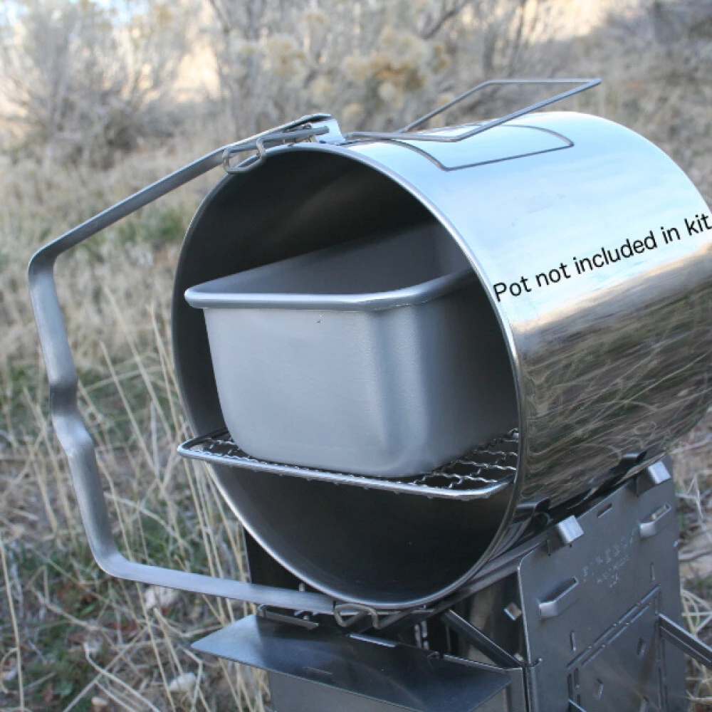 Designed for dry baking in the Firebox 16cm 3qt Billy Bush Pots! The Firebox 16cm Baking Kit allows you to bake biscuits, cakes, slice, sausages, eggs, omelettes, quiche, bread & bread rolls etc. To bake, place a pan on the included Smoker Grill which allows room to placement of a few coals underneath. Use the Roof Rack to place coals on top of the Firebox Pot. Placing a few rocks under the Smoker Grill can help evenly distribute the heat and prevent burning. The baking kit fits inside the Firebox 16cm Billy Pot to minimize space (except for the lightweight tongs). 16cm Baking kit includes: – 1x Large Rectangle Bread Pan – 1x Large Square Cake Pan – 1x Lightweight Stainless Steel Tongs – 1x Hard Annodised Lightweight Pot Lifter – 1x Large Oven Smoker Grill – 1x Coal Roof Rack – Note: The Baking Kit does NOT include a pot. You will require a Firebox stove and Firebox 16cm (3 qt) Pot to use this kit. Baking Horizontaly May Cause Warpage to your pot. Small amounts of oval can be straightened by hand, more severe cases require mechanical force. These four tips will help you avoid problems: 1) Don’t be in a hurry, a small amount of flame is plenty. If using a Trangia keep the simmer ring on. Even if it’s fully open it will lower the temp to a reasonable level. 2) Use rocks or equivalent thermal mass inside the oven, they will help regulate the temp. 3) Use a thermometer so you know when to lay off the heat. (16cmBakingKit)
