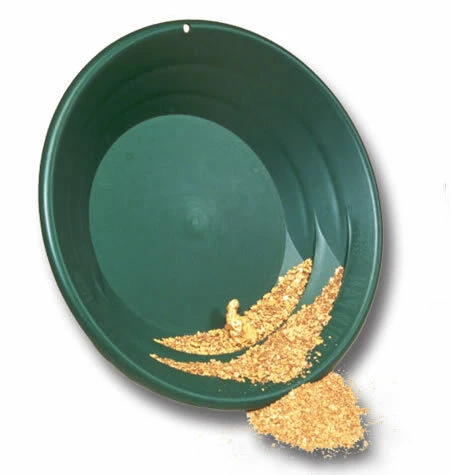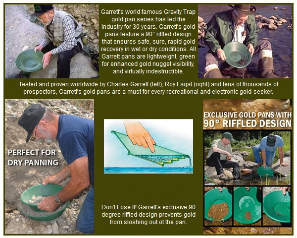 Garrett 15″ SuperSluice Pan Garrett’s world famous Gravity Trap gold pan series has led the industry for 30 years. Tested and proven worldwide by Charles Garrett, Roy Lagal and tens of thousands of prospectors, Garrett’s gold pans are a must for every recreational and electronic gold seeker. Don’t Lose It! Garrett’s exclusive 90 degree riffled design prevents gold from sloshing out of the pan. Features: Size: 15″ Great for wet/dry conditions Traps fine gold to nuggets over 1 oz Twin 1/2″ riffles Deep throat funnel Made in USA (15SSLUICE)