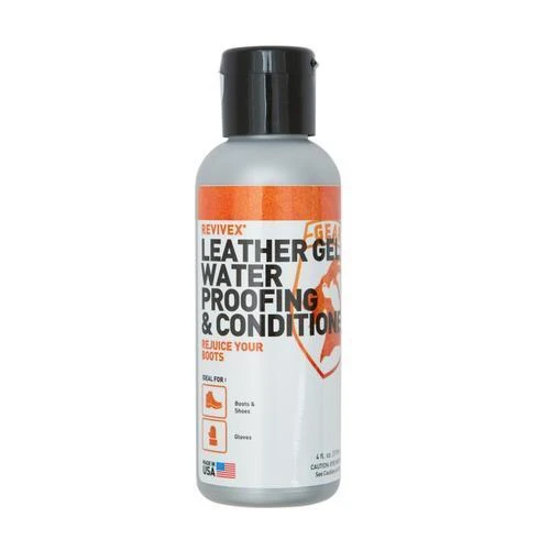Dry feet are essential to a great outdoor experience. So, before you head for the lake, the hills or the campsite, treat your leather boots to Gear Aid’s ReviveX Leather Gel Water Repellent and Conditioner. Specially designed for full-grain leather care, the ReviveX Leather Gel Water Repellent and Conditioner makes it easy to waterproof new boots, as well as restore older boots to like-new condition. The formula soaks into leather, for a deeply penetrating, high-tech solution to rain, puddles and mud. It won’t affect breathability, so it’s great for GORE-TEX® footwear. With Gear Aid’s ReviveX Leather Gel Water Repellent and Conditioner, your boots will be waterproof, your feet will stay dry, and you’ll be much happier to be outdoors—no matter what the weather brings. High performance leather water repellent gel Waterproofs leather boots and shoes Penetrates deeply to condition leather Gives leather footwear a rich, outdoor look Safe for waterproof-breathable footwear including GORE-TEX® and eVent® Made in USA (36260)
