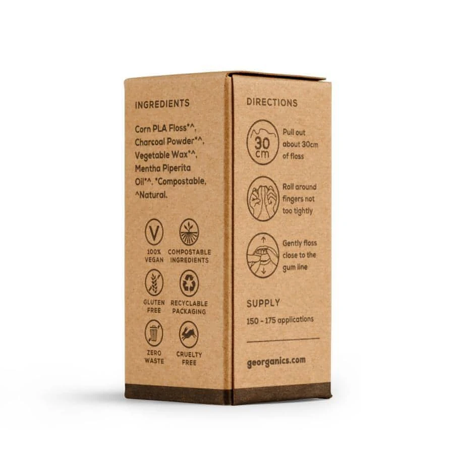 Georganics Dental Floss Activated Charcoal 50m This dental floss is made from a blend of Charcoal fibres and compostable Corn-base PLA, coated with Vegetable wax and organic Peppermint oil. Studies have shown Peppermint oil to be extremely effective at killing anaerobic bacteria, left untreated this bacteria can cause gum disease. Flossing daily helps to remove food debris and prevent bacteria from the areas that sometimes regular brushing cannot reach. Features: 100% compostable Corn-PLA 50m floss with refillable dispenser Plastic-free, Vegan & Cruelty-free How to: Gently pull out about 30 centimetres of floss and roll the floss around your thumb to control the strength and position. Floss slowly between each tooth, reaching close to the gum line. (77158)