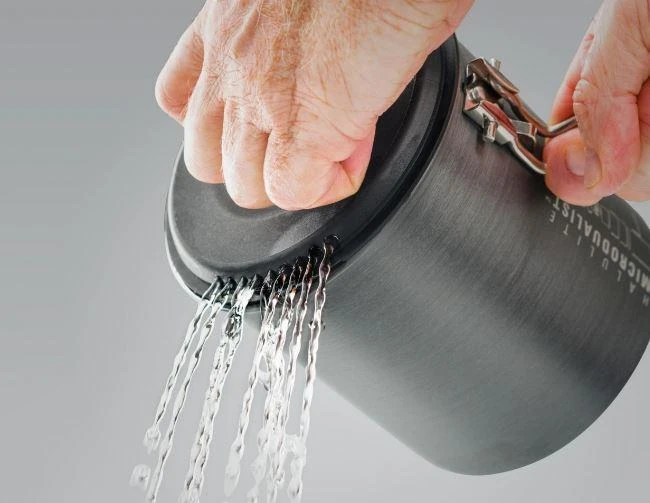 Ultralight Halulite MicroDualist Set – Integrated Cooking & Eating Solution • Crushproof, heat-resistant, nylon lid won’t deform in packs and includes an integrated strainer. • Folding handle locks into place for cooking and secures entire set for transport. • Folding Foon ( our spork upgrade ) goes from under 10 cm pack length to 15 cm eating length. • Convenient graduations moulded into the pot make for easy measuring. • Welded stuff sack holds set while travelling and doubles as a sink or washbasin in camp. • Integrated nesting allows for ultralight stowing of micro stoves and 110 g fuel canisters (not included). • Material: Hard Anodised Aluminium, Clear Polypropylene, Nylon 6-6 • Includes: 1.4 L Pot, Strainer Lid, 2 414 ml Mugs w/ Insulated Sleeves, 2 414 ml Bowls, 2 Sip-It Tops, 2 Folding Foons, Welded Stuff Sack/Sink • Dimensions: 14 cm x 14.2 cm x 15 cm (F55050247)