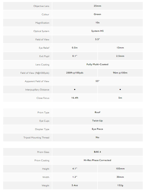 Hawke Endurance ED Premium Monocular 10×25 Green Stunning premium optics provide crisp, clear and bright images with enhanced light transmission. Endurance ED Monocular benefits from the System H5 optics. ED glass is utilised to reduce colour fringing. The Fully Multi-Coated lenses provide high resolution images which ensure no details are lost when viewing at distances down to 5m. Effortless focusing and impressive depth of field makes these binoculars quick and easy to use. Water and fog proof with a high grip rubber coated body, Endurance is designed to battle the elements. Features: Smart texture side body grip Crisper cleaner Image than The Nature-Trek Model Lanyard Hole Extra-Low Dispersion (ED) Glass Phase Corrected High Resolution Phase Corrected BAK-4 Roof Prisms Focus From 5m Twist-Up Eye Cups With Position Stops Stay-On Lens Covers Nitrogen Purged, waterproof and Fog proof Specifications: Click Here for Manual Objective Lens: 25mm Colour: Green Magnification: 10x Optical System: System H5 Eye Relief: 13mm Exit Pupil: 2.5mm Lens Coating: Fully Multi-Coated Field of View (ft@1000yds): 96m @100m Apparent Field of View: 5.5° Close Focus: 5m Prism Type: Roof Eye Cups: Twist-Up Diopter Type: Eye Piece Tripod Mounting Thread: No Prism Glass: BAK 4 Prism Coating: Hi-Res Phase Corrected Height: 105mm Width: 30mm Weight: 152g (36311)