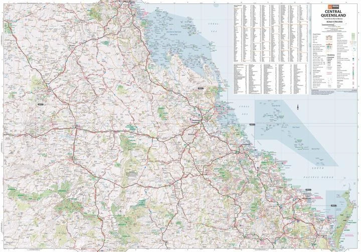Central Queensland Map (1st edition) A regional map of central Queensland (1:1,000,000) that stretches inland past Jericho and from Maryborough in the south to Mackay in the north. On the opposite side is tourist information on the region, as well as inset maps of Mackay, the Capricorn Coast, Gladstone, Bundaberg, Rockhampton, and the Gemfields. Accompanying each inset map are photos as well as background and travel information on the region that help for planning and touring. Key Features Inset town and city maps National parks Tourist information Camping and rest areas Index and distance charts Key Specifications Edition: 1st Scale: 1:750,000 Folded size (WxHxD): 140mm x 250mm x 3mm Flat size (WxH): 700mm x 1000mm (9321438001584)