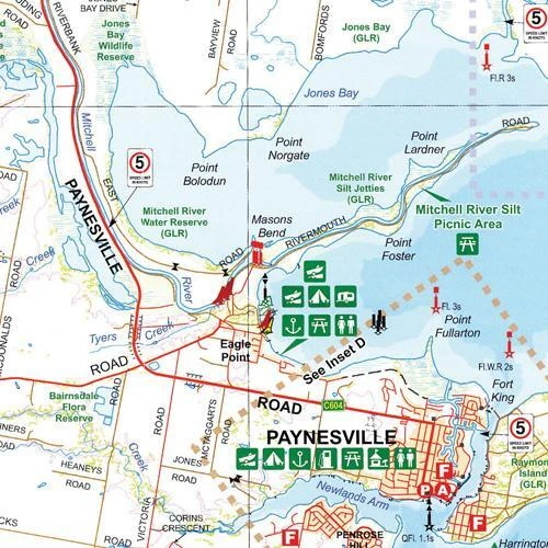 An outdoor recreation guide that covers Nicholson, Mitchell, Tambo and Latrobe River Entrance, Loch Sport, Metung and Lakes Entrance. The map is ideal for boating, bushwalking, cycling and car touring. The Gippsland Lakes recreation guide has been developed in consultation with Parks Victoria, Gippsland Port, East Gippsland and Wellingtons Shires. Scale: 1:100 000 Includes: Boat ramps Marine Navigation features Walking tracks Major town facilities Emergency phone numbers Local tourist information centre phone numbers (9780980349986)