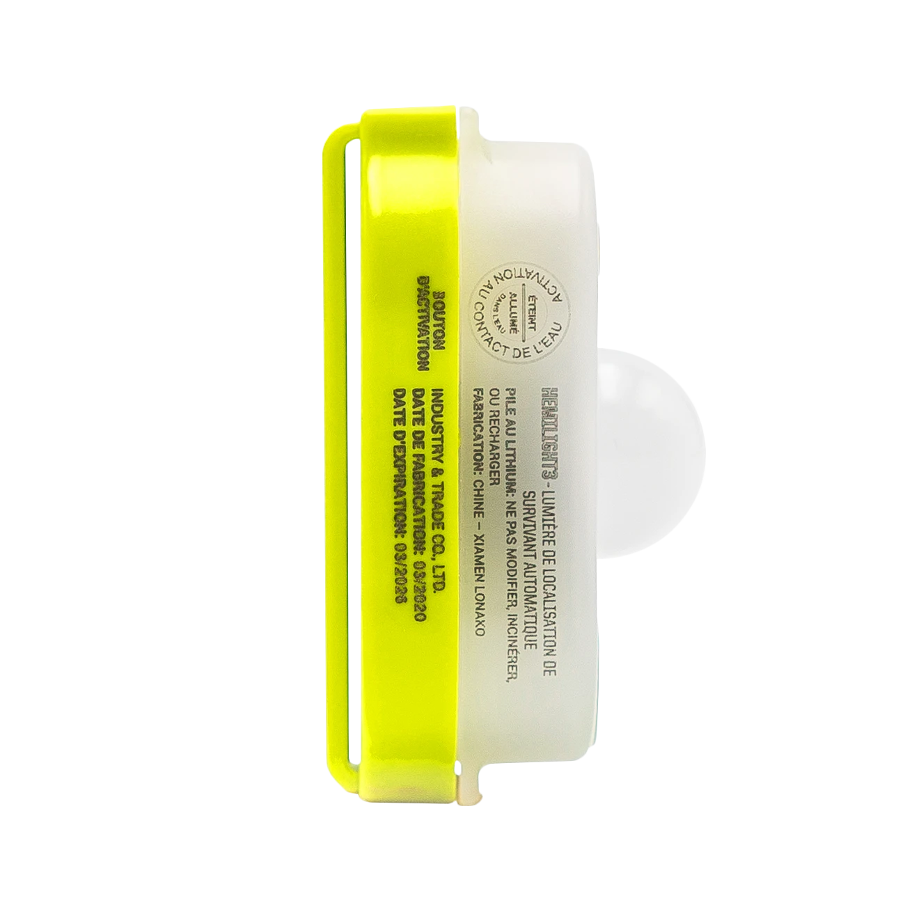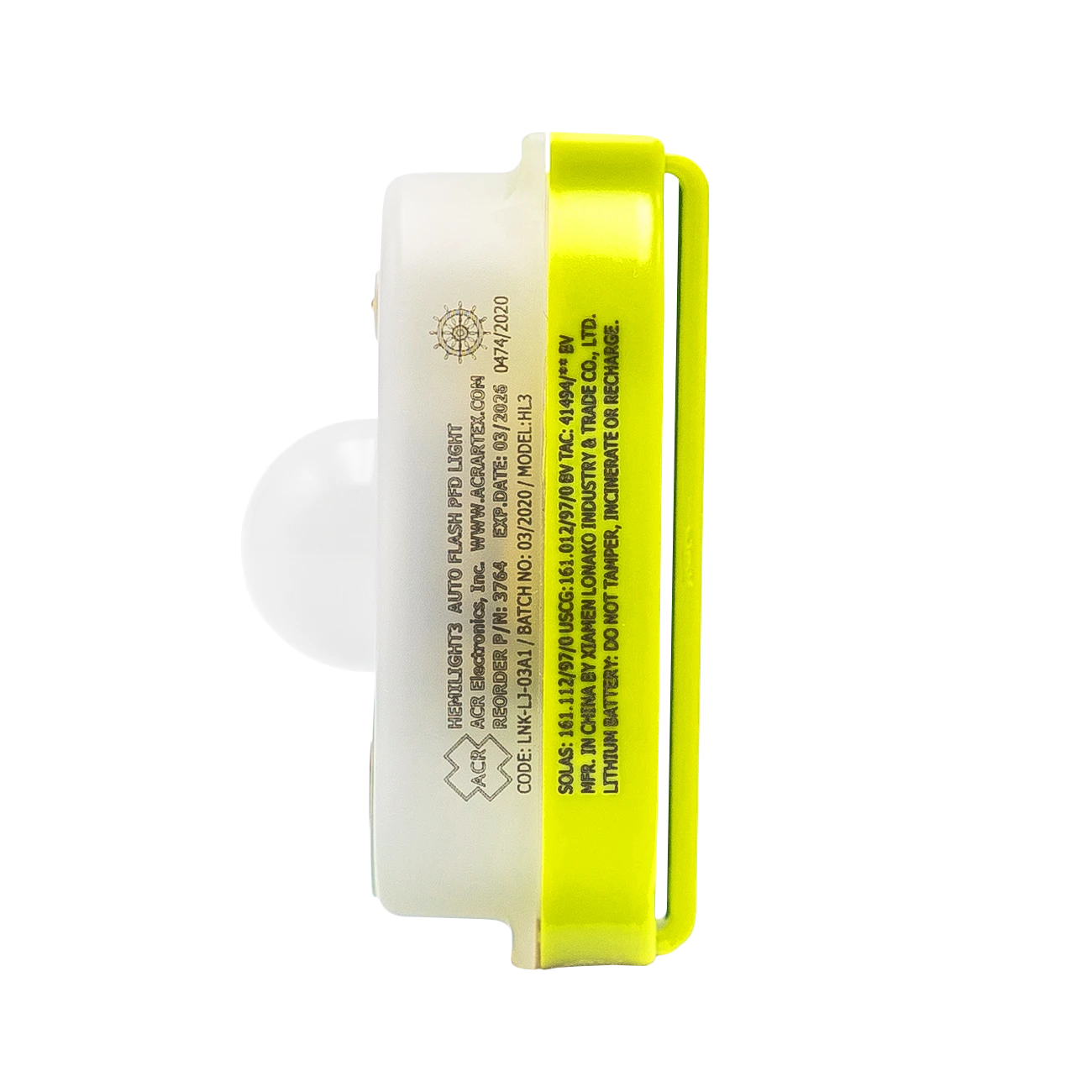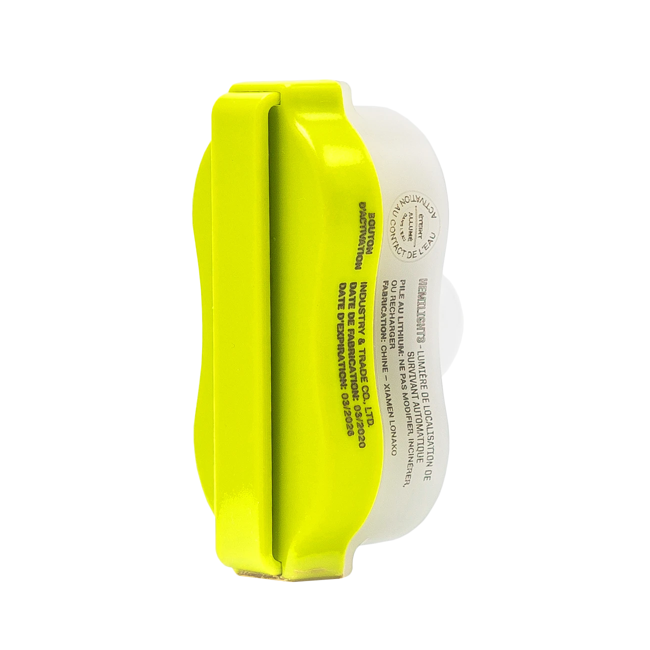 HemiLight 3 Smaller than other approved lights, the HemiLight 3 features rounded edges to maintain the integrity of inflatable life jackets. Attachment loops accommodate webbing of up to 5 cm width. The marine tough design ensures years of useful service. The #1 choice of cruise ships and maritime vessels. The HemiLight 3 offers a basic strobe mode which is activated automatically in water. The high-intensity flashing LED light automatically activates for 20+ hours when it comes in contact with salt or fresh water, and can be deactivated simply by pushing the red button. Once the sensor is wet, and the light is on, the light will stay on even if the sensor is dry, unless manually deactivated. The light can be activated and deactivated manually only when the water sensors are wet. Features: LED Strobe Light Fresh or Salt Water Activated Manual Deactivation 20+ Hours Ideal for Boating or Water Sports Specifications: Click Here for Spec Sheet Size: 6.19 x 3.02 x 2.87 cm Weight: 28 g Battery: Non-hazardous lithium. 5-year life (non-replaceable). Meets DOT and IATA rules for safe transport. Material: Polycarbonate Activation: Automatic when in contact with water (fresh or salt), deactivate via manual off button. Waterproof: Watertight to 3 m. Meets the IMO standard. Beam Angle: All directions of the upper hemisphere. Operational Life: Exceeds 8 hr. requirement, typically 20+ hours Operating Temperature: -1°C to 30°C Storage Temperature: -30°C to +65°C Approvals: USCG SOLAS, MED SOLAS (HL3)