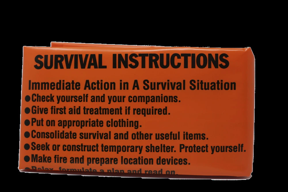 A bright highly visible, heavy duty, full sized orange survival poly bag printed with survival instructions covering fire making, navigation and shelter. Specifications: Material: Finnex20 High Strength Colour: Highly Visible Orange Construction: Bottom Welded Thickness: 70mu Size: 720 x 915 x 1830mm Weight: 300g NATO: NSN-8465-99-684-4041 (RP044)