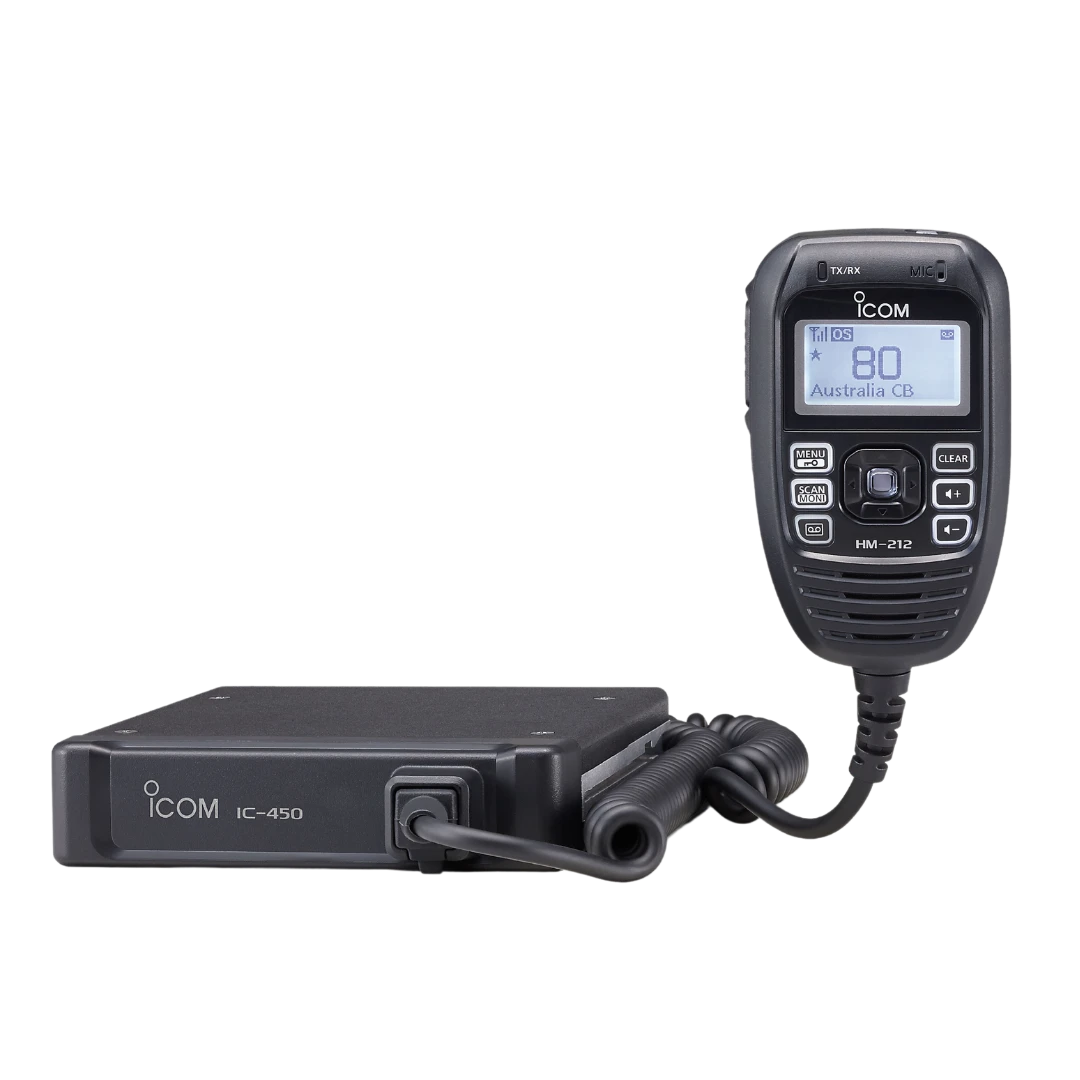 Icom IC-455 80 Channel 5w UHF CB Radio The Icom IC-455 is made in Japan to the highest specifications and quality, it’s reliability is second to none. The Icom IC455 provides excellent performance with full 5 watt power and with it’s automatic volume control and instant record/playback you’ll never miss a transmission. The remote speaker/mic allows for easy installation into modern vehicles and the customisable LCD display allows you to assign different colours for different channels & functions. Built with Icom’s renowned reliability and backed by a 5-Year Warranty. Features: Loud, Clear & Easy-to-Use 80 UHF CB Channels Additional 176 Receive only channel (400-520MHz) 5 Watt RF Output Power. 5 Watts (High) and 1 Watt (Low) selectable output power Seven-Colour Backlight LCD. The colour of the LCD Screen can be changed to reflect the operating status. Different colours can be assigned to channels, and colours can be set to indicate when scanning or transmitting Scrambler Encryption with selectable subcarrier IP54 Water Resistance & Dust Protection Noise Reduction, Audio Equalizer & Voice Changer: The Noise Reduction reduces background noise from both transmit and receive audio Voice Recorder & Instant Play Back: Can record up to 10 messages of 30 seconds each, for a total of 5 minutes Supports Both 12 V/24 V DC Power Sources. Accepts a 12/24 V DC power source and it is suitable for most types of cars and trucks Dynamic Group Scan for Keeping Group Communication. Using a CTCSS or DTCS tone, this function finds an open channel for group communication Pocket Beep, Selcall & Stun Made in Japan Box includes: 1x IC-455 UHF CB 1x HM-244 LCD Speaker Microphone 1x Mounting Bracket 1x DC Power cable 1x Mike Clip 1x User Manual Click here for detailed Specifications Click here for User Manual (IC-455)