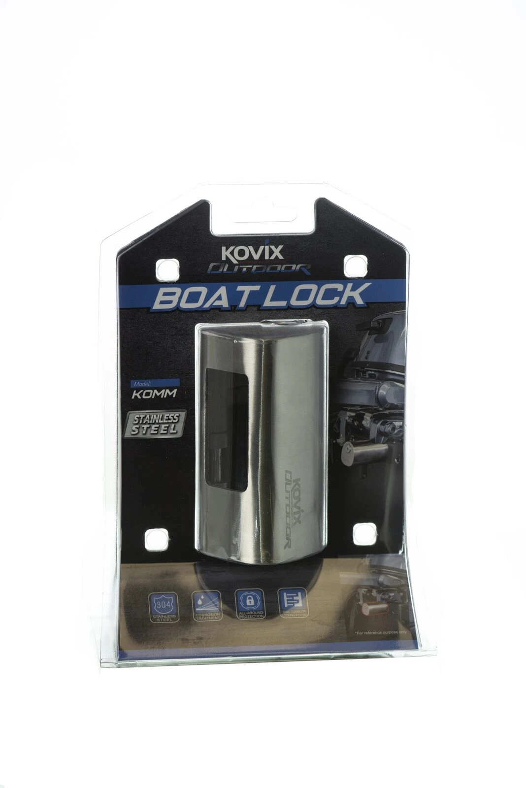 Kovix Stainless Steel Outboard Boat Lock Secure your outboard motor and protect it from theft with the Kovix Outboard Boat lock. This clever lock encloses the clamp bolts with a robust stainless-steel body to prevent a thief from unscrewing them and stealing the motor. Experience the Ultimate protection with the Kovix Range. Features Quality 304 stainless steel for strength & durability Suitable for most brands of outboard motors up to 25hp Simple and easy to use Maximum security and smart looking Corrosion Treatment All-Around Protection Disc Tumbler Locking System Specifications Dimensions: 54.1mm x 61mm x 112mm Weight: 760grams approx Includes: 1x Kovix Boat Lock, 3x Keys, 1x Coded Tag (KOMM)