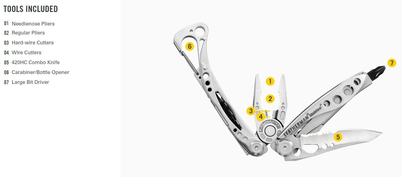 Leatherman Skeletool Coyote Tan At a mere five ounces, the Leatherman Skeletool has a stainless steel combo blade, pliers, bit driver, removable pocket clip and carabiner/bottle opener. The Skeletool is just what you need in one good lookin’ package. FEATURES 1) Handle Bit Storage Conveniently store Leatherman tool bits in the handle of your multi-tool for easy access in the middle of a job, or for safe keeping when not in use. 2) Locking Blade A knife blade that locks into place when fully deployed. A user must manually unlock the blade to fold it away, which allows for a much safer user experience. 3) Replaceable Pocket Clip A removable clip which allows the user to wear their multi-tool attached to a pocket or belt loop without the use of a sheath. By removing the clip, the user is able to easily carry their tool in a sheath if preferred. 4) Outside-accessible Features This multi-tool features tools that are accessible while the tool is in its folded or closed position, mimicking the functionality of a pocket knife. 5) One-hand Operable Features Every feature on this tool can be opened and operated with one hand. This enables the user to keep the other hand free for situations that require multi-tasking or a free hand. SPECS CLOSED LENGTH: 4 in | 10 cm OPEN LENGTH: 6.0 in | 15.24 cm BLADE LENGTH: 2.6 in | 6.60 cm WEIGHT: 5.0 oz | 142 g WIDTH: 1.24 in | 3.15 cm OVERALL THICKNESS: .52 in | 1.32 cm MATERIALS: 420HC Stainless Steel INCLUDED BITS: Phillips #1 & #2, Screwdriver 1/4″ & 3/16″ Made in the USA 25 Year Warranty (YL832207)