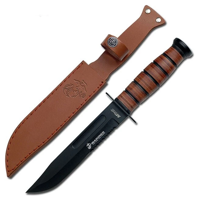 Marines Partially Serrated Fixed Blade Knife The MTech Black Partially Serrated Blade is designed for the Marines. It is a strong stainless steel blade with a leather-wrapped aluminum handle with the Marine logo on both the knife and the leather sheath it comes in. This is a stunning knife with a beautiful leather sheath. Features: Stainless Steel 1/3 Serrated Black Clip Point Blade Leather Wrapped Aluminum Handle Includes Leather Sheath Official Licence from U.S.M.C Specifications: Blade Type: Clip Point Blade Material: 440C Stainless Steel Blade Length: 180mm Total Length: 304mm Weight: 290g Please note: You must be over 18 to purchase this product. (K-MT-122MR)