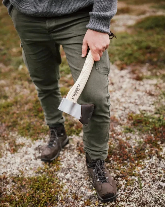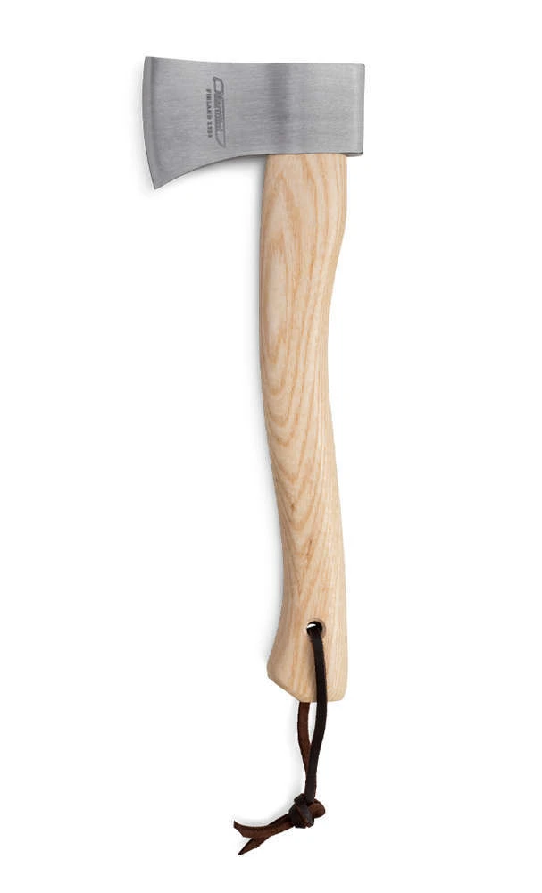 Marttiini Camping Axe The Marttiini Camping Axe is an extremely high quality Axe with a High Carbon Steel axe head and a beautiful ash wood handle. The Marttiini Camping Axe is a lighweight and easy to carry axe suitable for long hikes and camping trips and perfect for splitting firewood. The Marttiini comes with a leather lanyard strap to prevent injury and provide carrying options. Features: Small and lightweight for camping and hiking Ideal for splitting firewood Made with High Carbon Steel to last a lifetime Timeless Traditional Light Brown Leather Sheath Traditionally handcrafted in Finland since 1928 Specifications: Blade material: High Carbon Steel Axe head: 13×8 cm Handle material: Ash wood Handle length: 38.5mm Axe Head Weight: 600g Sheath: Traditional Leather Total Weight with handle & leather sheath: 780g Made in Finland (1031030)