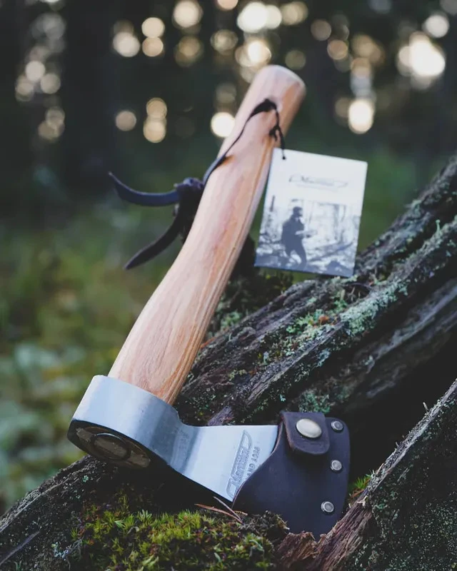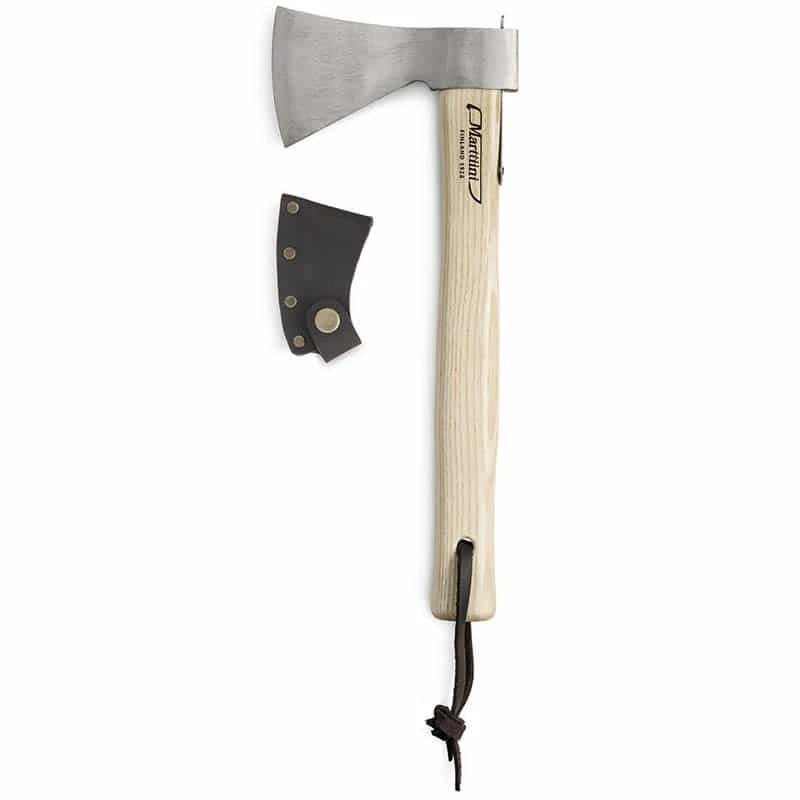 Marttiini Hiking Axe The Marttiini Hiking Axe is an extremely high quality Axe with a High Carbon Steel axe head and a beautiful ash wood handle. The Marttiini Hiking Axe is a lighweight and easy to carry axe suitable for long hikes and camping trips and perfect for splitting firewood. The Marttiini comes with a leather lanyard strap to prevent injury and provide carrying options. Features: Small and lightweight for camping and hiking Ideal for splitting firewood Made with High Carbon Steel to last a lifetime Timeless Traditional Brown Leather Sheath Traditionally handcrafted in Finland since 1928 Specifications: Blade material: High Carbon Steel Axe head: 14×8 cm Handle material: Ash wood Handle length: 34mm Axe Head Weight: 300g Sheath: Traditional Leather Total Weight with handle & leather sheath: 600g Made in Finland (1031010)