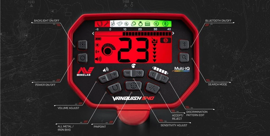 Minelab Vanquish 540 Pro Pack VANQUISH 540: for the serious detectorist who demands ultimate performance. One of the best detectors available for beach detecting due to it’s ability to handle high mineralisation from salt water. As if Multi-IQ technology, audio control, and pinpoint weren’t enough the 540 also boasts iron-bias control, red LED backlight and rechargeable batteries. What’s more, it comes with a waterproof 12” coil as standard for greater depth. No matter where the hunt takes you, the 540 is the ultimate detector that lets you detect on your terms. * VANQUISH 540 Pro-Pack is based on the standard VANQUISH 540 but with the following differences: Includes Bluetooth wireless headphones instead of wired headphones Includes Both the V12 12″ Coil and V8 8″ Double-D coil and coil covers (skidplates) Features: SIMULTANEOUS MULTI-FREQUENCY: Why Multi-IQ? Because with Minelab’s revolutionary Multi-IQ technology, you’ve got the combined power of multiple detectors in one — all working for you at the same time. Simply turn on and go. Nothing goes undetected and no terrain is off limits and the 540 finds deep, deep treasures. Silver, gold or jewellery. Park, field or beach. Unearth the power of VANQUISH with Multi-IQ. ALL METALS. ALL SOILS. ALL THE TIME. ALL-TERRAIN: No matter what you seek, VANQUISH has you covered. Simply select one of the five Search Modes — Coin, Relic, Jewellery, Custom or All Metal — then start swinging. Each mode is pre-programmed and optimised to give you the best performance, anytime and anywhere: park, field or beach. You can even save your favourite settings to a custom Search Mode. VANQUISH welcomes tough terrain. It dominates at the beach in wet sand and salt water, outperforming other detectors that can’t compete. 12 discrimination segments deliver control over what metals you want to accept or reject. PACK AND CARRY: 1.3kg light with a unique collapsible snap-lock system makes it easy to pack and go. WATERPROOF: Waterproof coils up to 1 m (3.3 ft) and Water Resistant control pod (with included Rain Cover). PINPOINT MODE: Included pinpoint mode to help you locate targets with extreme precision. Specifications: Custom User Search Profile: Yes Operating Frequencies (kHz): Multi-IQ Frequencies, 5 to 40 khz Noise Cancel: Auto (19 Channels) Bluetooth Audio: Yes Iron Bias: High (default), Low Selectable Sensitivity: 10 levels Volume: 10 levels Target Tones: 5 tones Discrimination Segments: 25 segments Target ID’s: -9 to 40 Depth Indicator: 5 levels Length: Extended: 1450mm (57″), Collapsed: 760mm (30″) Weight (incl. batteries): 2.9lbs (1.3kg) Coils: Includes Standard Coil V12 12″x9″ Double-D + V8 8″x5″ Double-D Audio Output: In-built loudspeaker, 3.5mm (1/8″) headphones or Bluetooth wireless headphones Supplied Headphones: Bluetooth wireless headphones Display: Monochrome LCD with red backlight Supplied Batteries: 4 x AA NiMH rechargeables with 240v mains charger Waterproof: Coil to 1m/3-feet, Control unit splashproof Operating Temperature Range: -10°C to +40°C (+14°F to +104°F) Storage Temperature Range: -20°C to +70°C (-4°F to +158°F) Key Technologies: Multi-IQ, Bluetooth, aptx™ Low Latency Warranty: 3 years control box and coil What’s Included: 1x Minelab Vanquish 540 Metal Detector 1x V12 12″ Double-D Coil 1x V8 8″ Double-D Coil 1x V12 12″ Double-D Coil Cover / Skidplate 1x V8 8″ Double-D Coil Cover / Skidplate 1x Set of Rechargeble Batteries 1x Mains AC Battery Charger 1x Minelab Bluetooth Wireless Headphones 1x Rain Cover for Control Unit 1x User Manual Click here for User Manual (3820-0004)