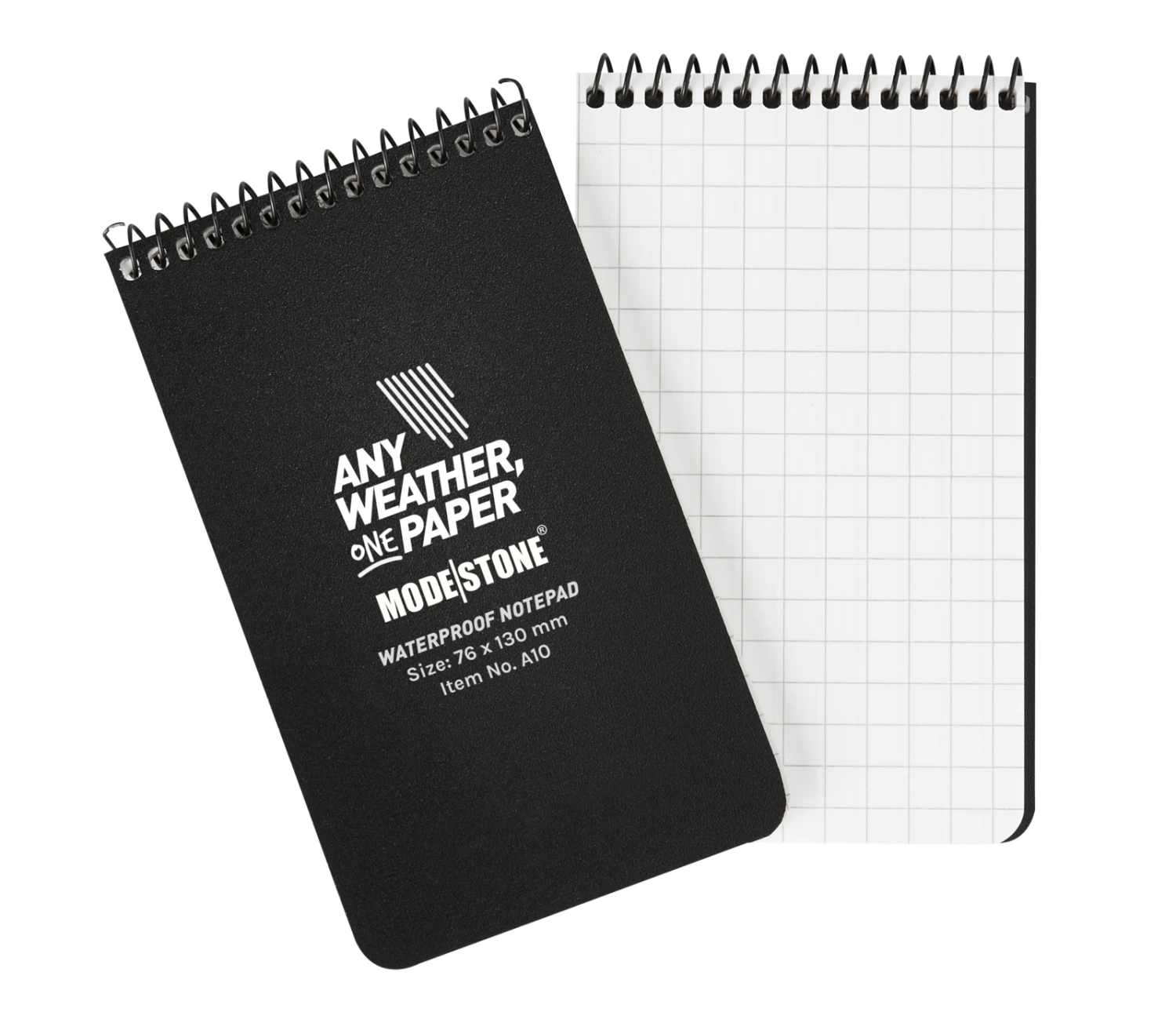 Modestone® notepads are a result of long-lasting product development. The idea of waterproof notepads started while the inventor, Kalle Kinnunen was serving in Finnish Defence Forces and his important notes from NCO School were destroyed by water. First problem was to find a perfect material for the pages and the Modestone® stone paper was the utmost best option. It withstands water and grease, does not tear easily and won’t get eaten by insects. Modestone® stone paper has another amazing feature: it allows you to write on it with an old key or even with a bullet. This feature allows you to write in tight spots without a pen. Modestone® stone paper is also an eco-friendly choice. Stone paper is made from 80% CaCo3 and 20% HDPE. Outer Colour: Black Pages colour: White Size – 3 in x 5 in (76mm x 130mm) Page Pattern – 7x7mm grid Binding – Top wire-o Spiral Number of Pages – 100 Weight – 0.13 lbs (60 grams) Number of Sheets – 50 (A10)