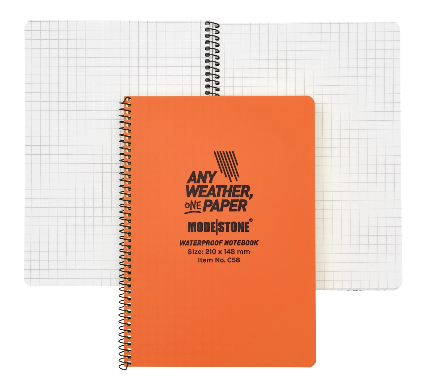 Modestone Safety Orange Side Spiral Notepad 210x148mm Modestone notepads are a result of long-lasting product development. The idea of waterproof notepads started while the inventor, Kalle Kinnunen was serving in Finnish Defence Forces and his important notes from NCO School were destroyed by water. First problem was to find a perfect material for the pages and the Modestone stone paper was the utmost best option. It withstands water and grease, does not tear easily and won’t get eaten by insects. Modestone stone paper has another amazing feature: it allows you to write on it with an old key or even with a bullet. This feature allows you to write in tight spots without a pen. Modestone stone paper is also an eco-friendly choice. Stone paper is made from 80% CaCo3 and 20% HDPE. Outer Colour: Safety Orange Pages colour: White Size – 210mm x 148mm Page Pattern – 7x7mm grid Binding – Side wire Spiral Number of Pages – 100 Weight – 276 grams Number of Sheets – 50 (C58)