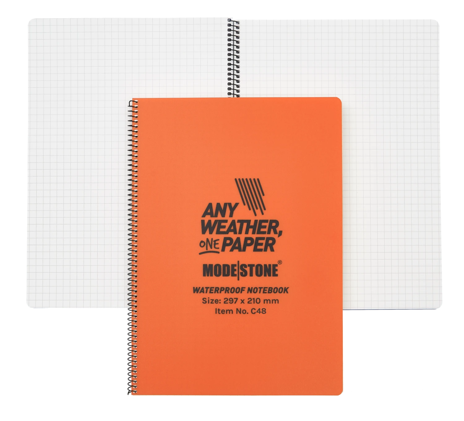 Modestone Safety Orange Side Spiral Notepad 297 x 210mm Modestone notepads are a result of long-lasting product development. The idea of waterproof notepads started while the inventor, Kalle Kinnunen was serving in Finnish Defence Forces and his important notes from NCO School were destroyed by water. First problem was to find a perfect material for the pages and the Modestone stone paper was the utmost best option. It withstands water and grease, does not tear easily and won’t get eaten by insects. Modestone stone paper has another amazing feature: it allows you to write on it with an old key or even with a bullet. This feature allows you to write in tight spots without a pen. Modestone stone paper is also an eco-friendly choice. Stone paper is made from 80% CaCo3 and 20% HDPE. Outer Colour: Safety Orange Pages colour: White Size – 297 x 210mm Page Pattern – 7x7mm grid Binding – Side wire Spiral Number of Pages – 100 Weight – 510 grams Number of Sheets – 50 (C48)
