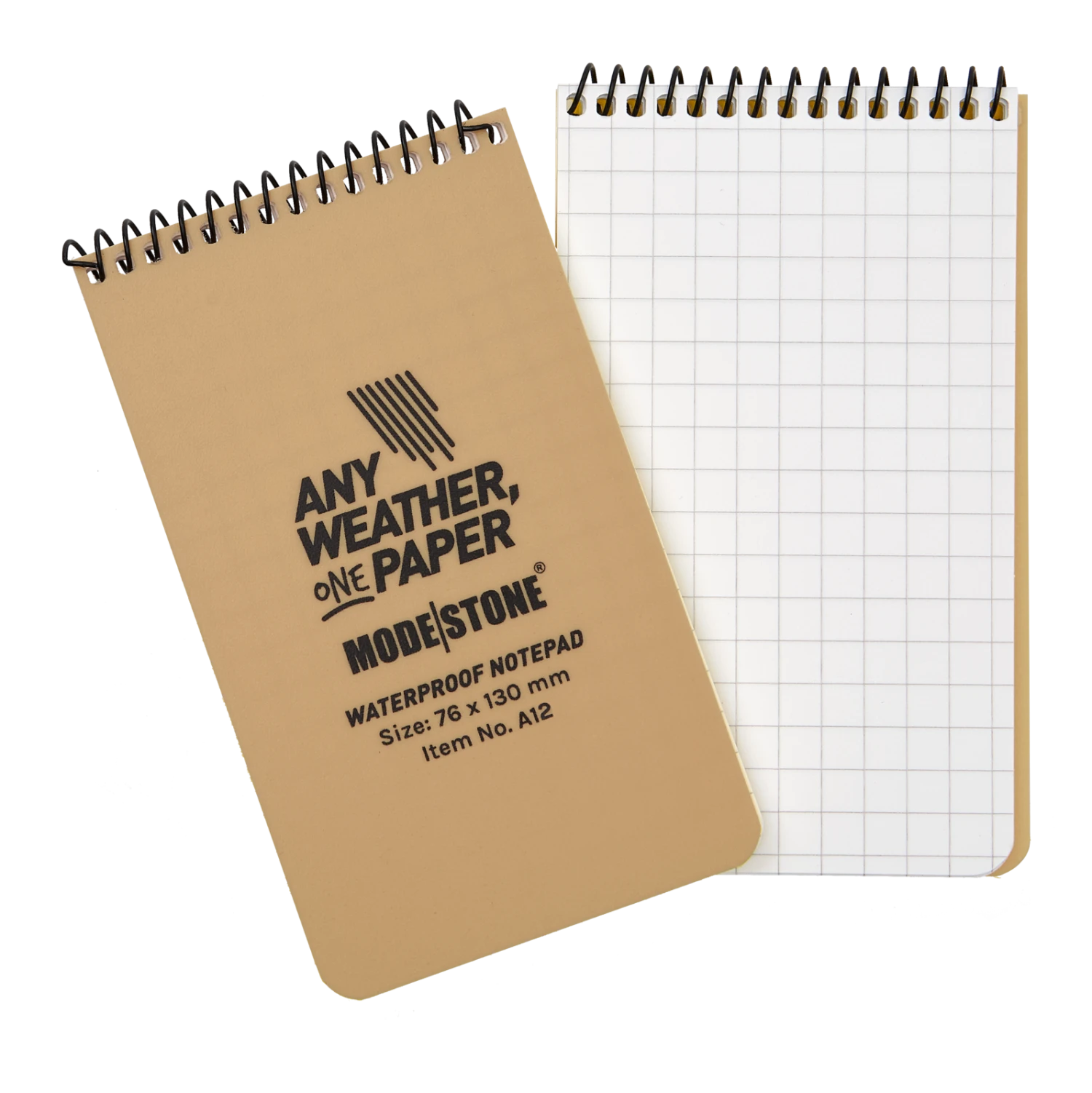 Modestone® notepads are a result of long-lasting product development. The idea of waterproof notepads started while the inventor, Kalle Kinnunen was serving in Finnish Defence Forces and his important notes from NCO School were destroyed by water. First problem was to find a perfect material for the pages and the Modestone® stone paper was the utmost best option. It withstands water and grease, does not tear easily and won’t get eaten by insects. Modestone® stone paper has another amazing feature: it allows you to write on it with an old key or even with a bullet. This feature allows you to write in tight spots without a pen. Modestone® stone paper is also an eco-friendly choice. Stone paper is made from 80% CaCo3 and 20% HDPE. Outer Colour: Tan Pages colour: White Size – 3 in x 5 in (76mm x 130mm) Page Pattern – 7x7mm grid Binding – Top wire-o Spiral Number of Pages – 100 Weight – 0.13 lbs (60 grams) Number of Sheets – 50 (A12)