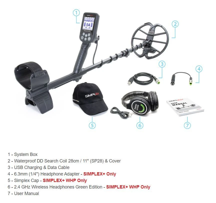 Nokta Makro Simplex+ ( WHP) Complete Pack With Wireless Green Edition Head Phones + Bonus PulseDive Pointer Simply unrivalled – The Nokta Makro Simplex+ is the first waterproof detector on the market offering extreme depth and high-end features at an entry-level price! Simple enough for beginners, yet impressive enough for experts! Are you new to metal detecting and simply need an easy to use detector? You cannot afford a high-end detector but you simply want extreme depth and basic features of a high-end device? Need a waterproof detector at an affordable price? If you said yes to one of the above, SIMPLEX+ is the sole choice that covers it all. Nokta Makro offers their first entry level detector, the SIMPLEX+, which makes quality metal detecting available and affordable for all users. SIMPLEX+ is a turn-on & go detector with auto ground balancing and boasts preset search modes, including a beach mode, in a very easy-to-use, single menu design. Whether you are searching for coins, artifacts or jewelry on land or underwater, SIMPLEX+ is the most cost-effective yet durable detector featuring a modern and lightweight style. With full customizability and online firmware updates you can keep up to date with the latest updates from the manufacturer. Features IP68 – Fully submersible up to 3 meters (10 ft) and protected from total dust ingress Built-in Rechargeable battery Lightweight – only 1.3kg Iron Volume – Turns off or adjusts the volume of the low iron tone Notch Discrimination – Discriminates Target IDs of unwanted metals Search Modes – Field / Park 1 / Park 2 / Beach / All Metal Built-in Wireless Module – Compatible with 2.4 GHz Nokta Makro Green Edition Wireless Headphones Vibration – SIMPLEX+ will vibrate upon detection of target! Ideal for the hearing impaired users as well as for detection underwater Frequency Shift – Get rid of EMI easily by shifting the frequency in small increments Lighting for Night & Underwater Use – LCD Backlight, Keypad Backlight and LED Flashlight Online Firmware Updates: Stay up-to-date with firmware updates (via USB on PC) and get the most out of your detector Specifications: Operating Principle: VLF Operating Frequency: 12kHz Search Modes: 5 (Field / Park 1 / Park 2 / Beach / All Metal) Audio Tones: 3 Notch Filter: Yes Pinpoint: Yes Vibration: Yes Frequency Shift: Yes Sensitivity Setting: 6 Levels Target ID: 00-99 Search Coil: Waterproof DD Search Coil – 28cm / 11″ (SP28) Display: Graphic LCD Backlight: Yes Keypad Backlight: Yes LED Flashlight: Yes Weight: 1.3 kg (2.9lbs.) including the search coil Length: 63 cm – 132 cm (25″ – 52″) adjustable Waterproof: IP68 up to 3 metres (excluding headphones) Battery: 2300mAh Lithium Polymer Runtime Per Charge: Approx 12 hours Warranty: 2 Years Nokta Makro Simplex+ WHP Contents: 1x Nokta Makro Simplex+ 1x 11″ (SP28) Waterproof DD Coil 1x 11″ (SP28) Coil Cover 1x 2.4GHz Wireless Headphones Green Edition & Charge Cable 1x Nokta Makro PulseDive Handheld Pointer with Cover & Charge Cable 1x USB Charging & Data Cable 1x Simplex Cap 1x Detailed User Manual Click here for User Manual (11000622)