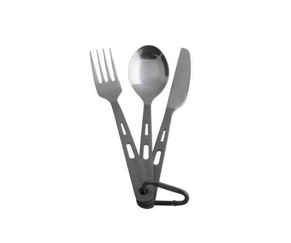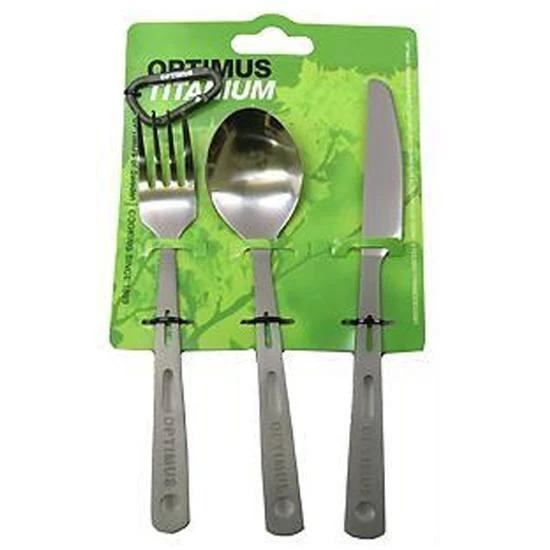 Optimus 3 Piece Titanium Cutlery Set Weighing in at only 52g, this little set of eating utensils is as good looking as it is functional. With polished eating surfaces and matt handles, and a carabiner clip to secure it within easy reach, you won’t know how you got by without it. Features Designed in Sweden. Matt finish Polished eating surface Extremely lightweight Includes Carabiner to clip the set together Made from Titanium Specifications Material: Titanium Weight: 52g Size: Length – 180mm (102028)