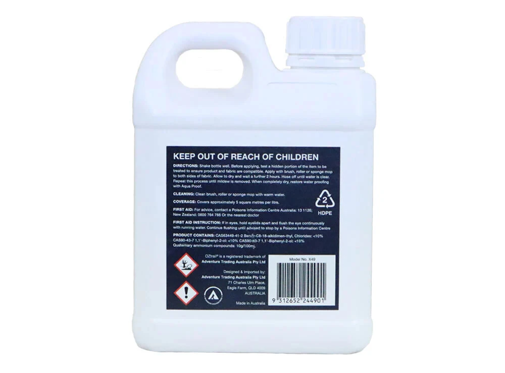 Mould Rid Fabric Cleaner 1 Litre Oops! Your canvas gear was packed away still wet and now mould has begun to grow. Worry not, this is a simple & easy way to get rid of mould. Simply apply to the affected areas of your canvas tent, swag or bags. Crack a beverage and wait for the magic to happen. Once it’s time wash the formula off and enjoy the results. Features: Formulated to remove Mould & Mildew Covers approximately 5 square metres per litre Get rid of mould & mildew from used canvas with ease Simply mix and apply to affected areas of your used canvas tent, swag, bags and more Specifications: Size: 1 Litre Suitable for: Canvas Coverage: 5m² per Litre approx Cleaning: Clean Brush, roller or sponge mop with warm water Directions: Shake the bottle well. Before applying, test a hidden portion of the item to be treated to ensure the product and fabric are compatible. Apply with brush, roller or sponge mop to both sides of fabric. Allow to dry and wait a further 2 hours. Hose off until water is clear. Repeat this process until mildew is removed. When completely dry, restore water proofing with Aqua Proof. (X49)