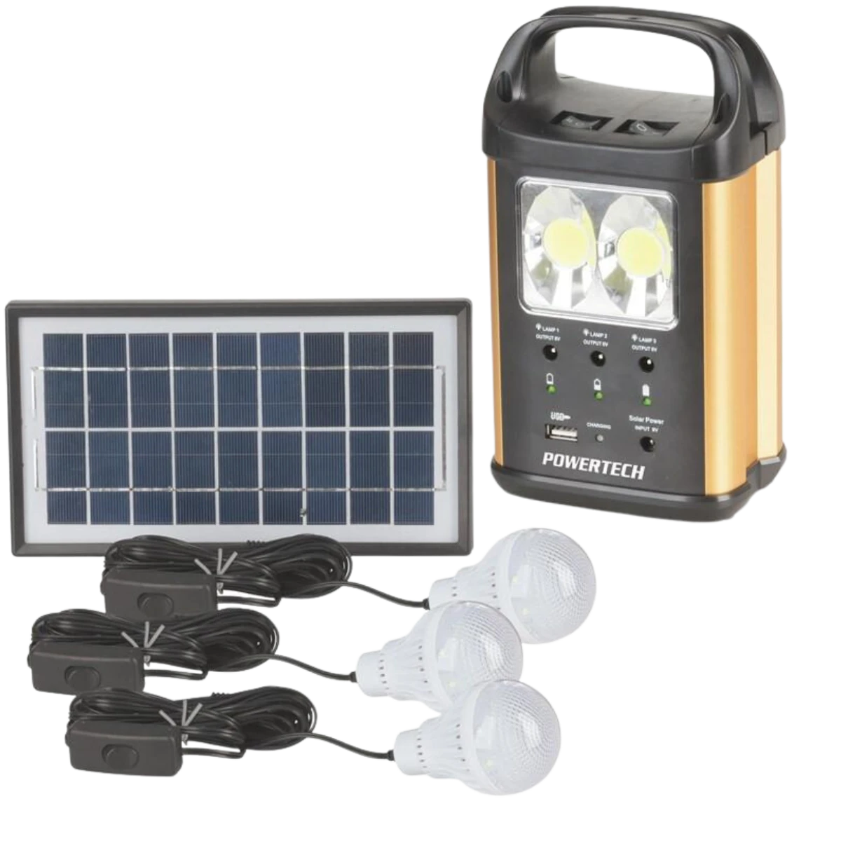 Portable Off Grid Solar Kit with LED Lights This Portable Off Grid Solar Kit is designed to provide bright LED lighting and mobile phone charging for off grid and emergency situations. Highly portable and quick to setup, the main charging station has a strong aluminium metal casing and carry handle and can power the supplied LED hanging lights and/or your mobile phone or tablet. You can use the included solar panel to keep it topped up or use the supplied 240v Charger to keep it charged and ready for storm season. Designed for: Off Grid Lighting Storm and Power Blackouts Camping Backup mobile lighting Specifications: Runtime: Up to 15 hours+ (using 1x light), Approx 4 hours+ using all lights 2x 120 Lumen (3w) Built-In LED lights 3x Hanging LED lights with inline switches 1x 7 Watt Solar Panel with lead 1x USB Mobile Phone Charging output Battery Level Indicator Solar Charge Time approx 13-15 hours (1 full day of sun) 1x 240v Plug Charger (approx 8-12 hours) Dimensions: 19 x 8 x 10cm Weight: 950g Internal Battery: 4500mAh In the Box: 1x Portable Solar Charging Station with Carry Handle 1x 7 Watt Solar Panel 3x Hanging LED Lights with inline switches 1x Hanging LED Light Extension Cable 1x 240v AC Charger 1x Carry Strap (MB3699)
